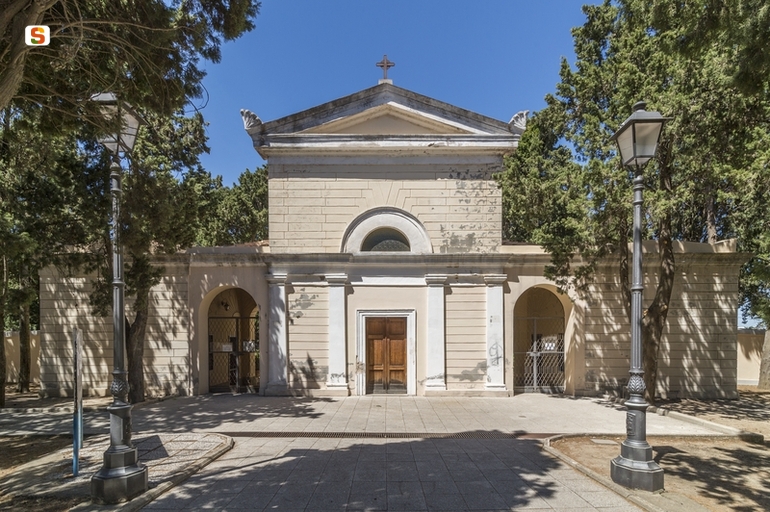 il Cimitero di Villacidro è ubicato N dell'abitato e costruito sulla naturale orografia del luogo. Vi si accede da SO, tramite un parco alberato e un viale che portano alla Chiesa Cimiteriale. Ai lati della stessa, in un'unica composizione architettonica di 20,85 metri sul fronte, con impianto planimetrico a T e l'abside semicircolare rivolta verso il recinto interno, si trovano simmetricamente i due ingressi ad arco a tutto sesto, l'ufficio del custode a destra e la sala mortuaria a sinistra. La Chiesa, alta internamente 6,50 metri, è un piccolo tempio con frontone e acroteri a palmette ai lati, diviso nella parte sottostante in due ordini: quello inferiore dato da 4 lesene che sorreggono un grande architrave a riseghe avanzate ai lati, e dalla porta centrale; quello superiore da una specchiatura listata a righe con lunetta a tutto sesto. Sull'asse centrale al termine del recinto si trova la cappella dell'Ossario, un'opera non coeva, si ritiene, all'impianto originario.