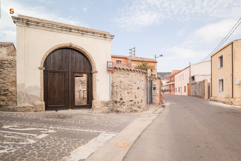 l’edificio, una casa campidanese a doppia corte su un leggero pendio, è ubicato lungo il Corso Umberto, la via principale del paese. Vi si accede oltrepassando il portale coperto con arco a tutto sesto in conci lapidei e chiave di volta con apposta una semisfera. Il cortile antistante ha una pavimentazione in cocciopesto e riquadri a laterizi. L'impianto planimetrico complessivamente è ascrivibile ad un corpo rettangolare di 16 metri per 13, con coperture a capanno e interamente in pietra a faccia vista. Sul lato SO addossata al corpo di fabbrica principale si trova la #lolla#, estesa per 12 metri sviluppata in due campate con architrave lignei. A sinistra e a destra dell'ex abitazione padronale a due livelli, si trovano due fabbricati di servizio. Il corpo centrale e quello di destra sono servite attraverso la #lolla# di due accessi con gradini per superare la quota di dislivello con la corte. Le stesse sezioni, una ospita #sa forredda#, consentono l'uscita verso la corte retrostante.