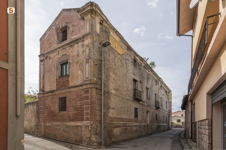 l’edificio, un palazzetto edificato nel XIX sec, rappresenta un’emergenza per l’eleganza del prospetto principale e per la ricchezza di decorazioni in parte ancora leggibili. Si sviluppa su 3 piani fuori terra, con un’altezza complessiva di circa 9 m e risulta compreso in un rettangolo di circa 25 per 6 m. Le facciate sono scandite da paraste con capitello sovrastante, il piano terra è in bugnato mentre i piani superiori risultano in parte intonacati e tinteggiati; le aperture sono squadrate e vi sono dei balconcini in ferro lavorato. Orizzontalmente è suddiviso da una zoccolatura, una cornice marcapiano e un cornicione di coronamento aggettante. La struttura portante è in pietra locale. La copertura è a doppia falda rivestita da manto di tegole curve. Gli infissi sono in legno con scurini interni.