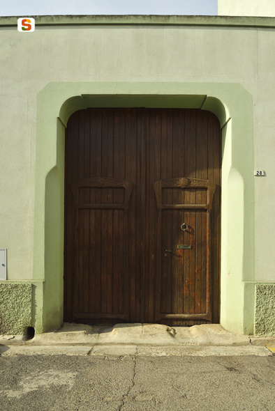 portale ligneo a doppia anta a forma rettangolare. L'imbotte è costituito da mattoncini pieni intonacati costruiti su due squadrati monoliti basali. Il portale ha una struttura a doghe accostate, montate su un telaio interno; presenta superfici lisce da cui risaltano due cornici di doghe che circoscrivono i bordi di un doppio ingresso pedonale rettangolare. Decorative modanature in rilievo sono presenti in corrispondenza degli ingressi. Il portale si affaccia su strada con 3,90 metri di altezza per 2,90 di larghezza. Continua in OSS.