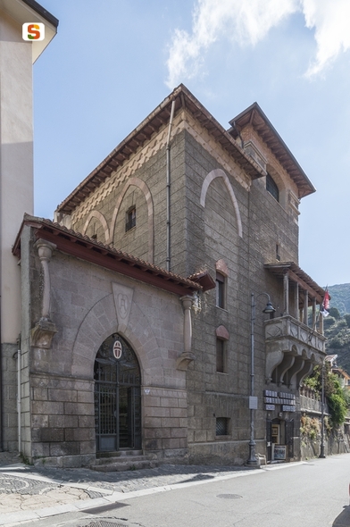 l'edificio presenta una forma a L, con un prospetto principale su Corso Umberto, lungo 13.20 m ca e alto 14 m ca. (altezza massima, 6.70, alla linea di gronda nell'ingresso). Interessante per le sue soluzioni decorative, esempio di gusto neo-medioevale tipico degli anni, si caratterizza per un ricco prospetto con continue riproposizioni di elementi caratteristici, quali archi a sesto acuto, cornicioni con merlature a coda di rondine. E' interessante anche il balcone con soluzione d'angolo, poggiante su imponenti mensole sagomate e sormontato da una copertura sorretta da eleganti colonnine di forma quadrata; il suo parapetto è tripartito e ritmato da decorazioni di regolare forma geometrica. Le altre due colonne presenti nel prospetto principale, posizionate lateralmente al portale d'ingresso, variano: hanno una base tonda e l'entasi. L'uso di pietrame, intonaci con finiture a finto bugnato e mattone, genera nel complesso armonia ed eleganza dei prospetti.