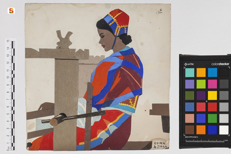 Donna di Desulo al telaio. ritratto di figura femminile in costume popolare sardo