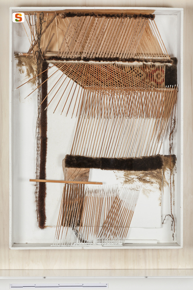 legno// colla// bastoncini di legno// filo di lana// pelliccia// tela/ pittura a olio