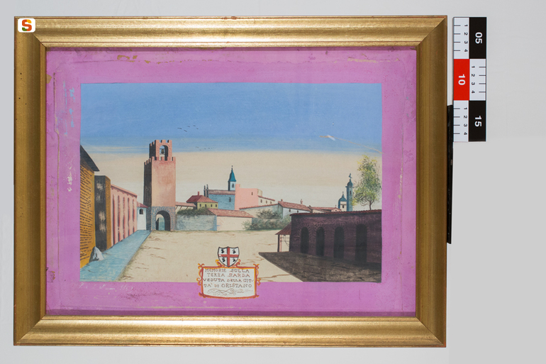 Memorie sulla terra sarda. Veduta della città di Oristano.. veduta