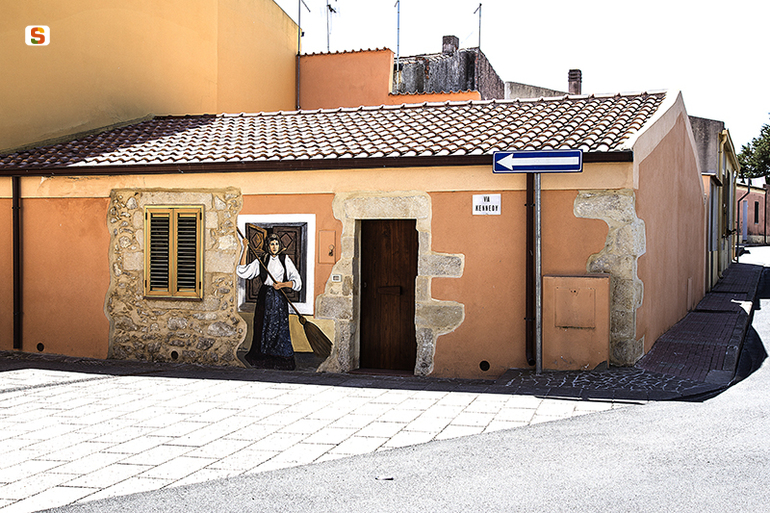 figura femminile in abito tradizionale sardo, architetture