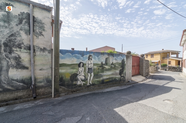 paesaggio ideale con nuraghe, figura maschile e figura femminile