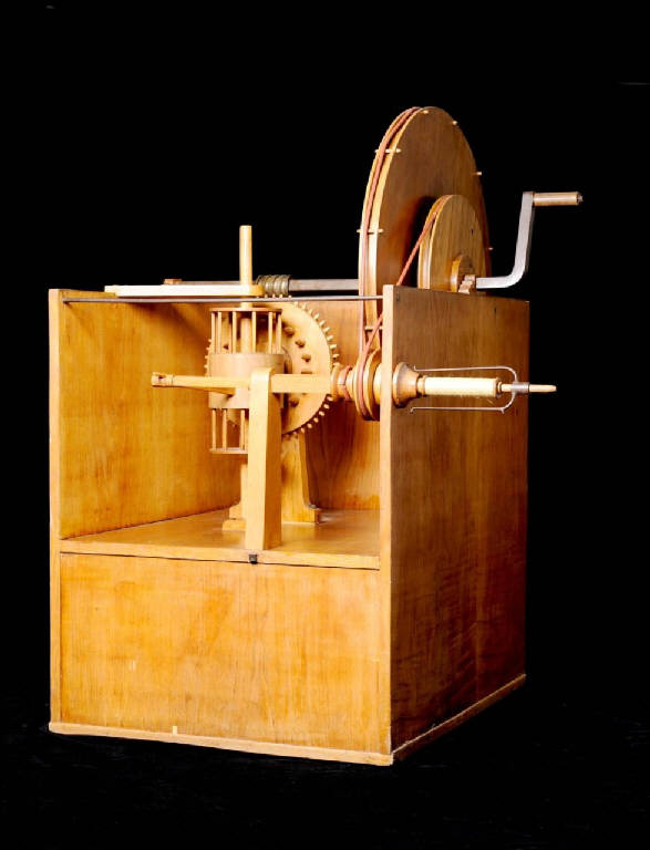 Il modello è costituito da una struttura di legno su cui sono posti, nell'ordine: una manovella che mette in moto una ruota,a sua volta collegata tramite una cinghia di cuoio a un albero; l'albero è costituito da due parti inserite una nell'altra, collegate rispettivamente al fuso e all'aletta. La grande ruota mette in moto anche una vite senza fine, che ingrana alternativamente due pignoni collegati a loro volta a una barra e all'albero del fuso.||