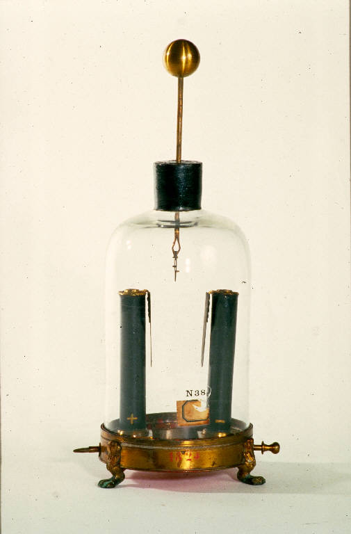 Lo strumento è costituito da una base di ottone circolare con piedini zoomorfi che sostiene una campana di vetro chius da un tappo di materiale isolante. Sotto la campana, appoggiate alla base, si trovano due pile a secco cilindriche di tipo Zamboni che tramite due sbarrette, poste agli estremi di un diametro della base, possono essere avvicinate o allontanate. Osservando il dspositivo si può notare che le sbarrette laterali sono differenti in quanto una termina in modo arrotondato mentre l'altra a punta; questa differenza tuttavia è apparente in quanto se vengono sfilate dallo strumento, si dimostrano essere uguali e atte allo stesso scopo, variare la distanza tra le due pile. La barretta terminante a punta ha perso la parte finale di forma arrotondata. Questo dispositivo permette di variare la distanza tra i piattelli entro cui è sospesa la foglia d'oro e quindi variare la sensibilità dello strumento. La mobilità delle pile è sostanzialmente possibile se dall'interno della base viene rimosso il disco di materiale resinoso presente. Quest'ultimo venne inserito solo in seguito per bloccare le pile stesse. Le due pile risultano essere disposte verticalmente poggiandosi sulla base ed in modo che i poli superiori abbiano polarità opposte. I due poli delle pile sono costituiti da due lamelle metalliche, disposte anch'esse verticalmente, che si affacciano tra le pile. Attraverso il tappo isolante della campana passa un'asta di ottone, che all'esterno termina con una sferetta anch'essa di ottone e all'interno con una pinzetta; questa originariamente sosteneva una foglia d'oro, attualmente mancante, che pendeva tra i piattelli metallici collegati ai poli delle pile