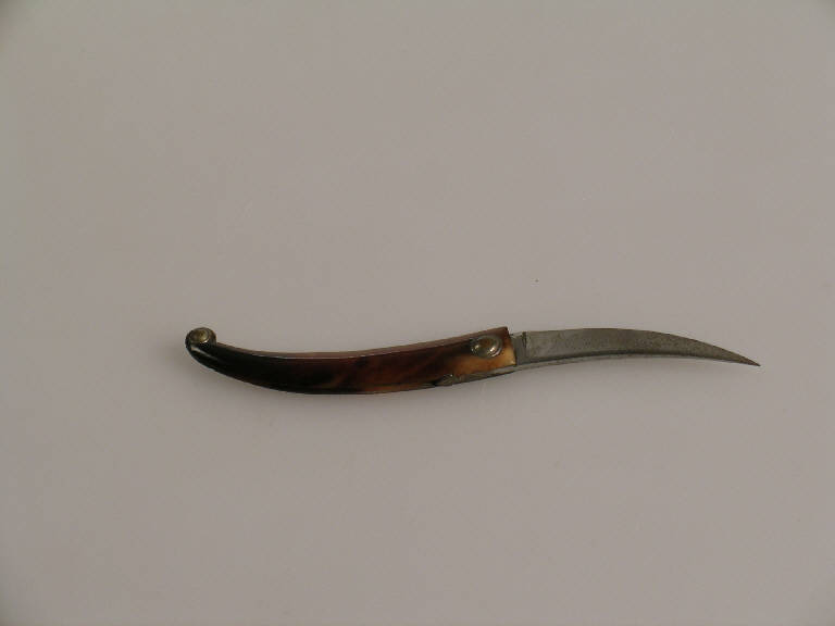 Bisturi a serramanico con impugnatura sagomata. La lama è tagliente lungo il lato convesso e leggermente ispessita sul lato opposto. Un piccolo prolungamento della lama, a forma di freccia, resta all'esterno dell'impugnatura quando lo strumento è chiuso e serve per estrarre più comodamente la lama, esercitando una leggera pressione. Il manico è composto da due lamelle di tartaruga, tenute insieme da viti poste alle due estremità