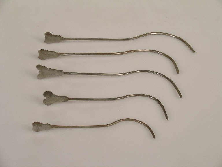 Sonde fortemente ricurve, dall'estremità arrotondata, dotate di un'impugnatura piatta e sagomata. Lungo la parte convessa corre una scanalatura