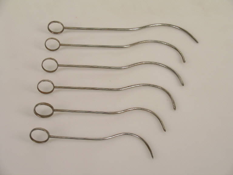 Sonde fortemente ricurve, dall'estremità arrotondata, dotate di un'impugnatura ad anello. Lungo la parte convessa corre una scanalatura