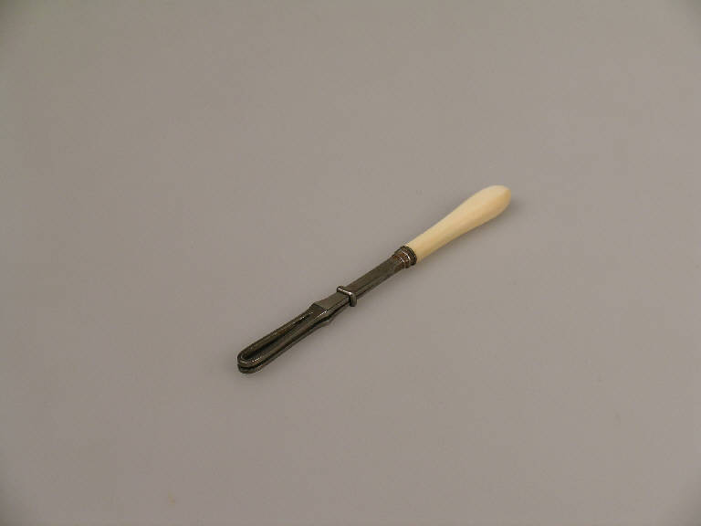 La pinzetta, dotata di un'impugnatura in avorio, ha i bracci che terminano a forma di spatola fenestrata. Grazie allo scorrimento di un anellino si può regolare l'apertura dei bracci