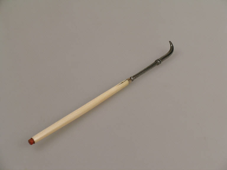 La pinzetta, dotata di un'impugnatura in avorio, ha i bracci che terminano a forma di uncino. Grazie allo scorrimento di un anellino si può regolare l'apertura dei bracci. Nel punto di innesto della pinzetta è presente un anellino di metallo che ha probabilmente la funzione di irrobustire il manico in un punto in cui facilmente potrebbero crearsi venature. Simmetricamente si trovava, all'estremità dello strumento, un anellino simile, oggi perduto