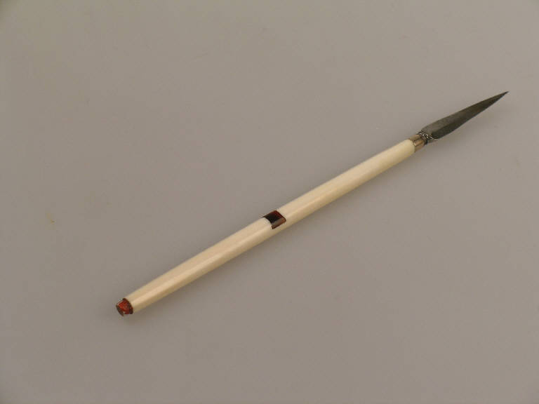 Su una lunga impugnatura di avorio a sezione ottagonale, decorata ad una estremità con una sottile fascetta di ottone e al centro con un piccolo inserto di osso, è fissata una lama appuntita e tagliente su entrambi i lati. La fascetta di ottone accanto alla lama ha probabilmente la funzione di rafforzare il manico nel punto di innesto della lama stessa. Simmetricamente si trovava, all'estremità dello strumento, una fascetta simile, oggi perduta