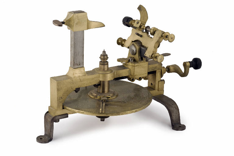 Struttura della macchina, realizzata principalmente in ottone, montata su sostegni fissati con viti al piano del tavolo. Piattaforma di ottone con dispositivo centrale modanato e sagomato. Alidada di ferro, piatta, a profilo curvo. Il carro, scorrevole sulla barra portante superiore mediante azionamento a manovella (curvilinea con pomolo terminale ligneo), è articolabile verticalmente a cerniera, allontanabile o avvicinabile al centro su cui è fermata la ruota da intagliare. Riporta sulla superficie nome inciso. Fresa azionata tramite archetto, la cui corda era avvolta su puleggia. Viti (fanno eccezione quelle a corredo dell'alidada, ellittiche e a farfalla) con testa circolare leggermente bombata e profilo zigrinato con linee incise oblique. Tre sostegni piatti e arcuati, terminanti con piede semicircolare e foro centrale per l'ancoraggio al piano di lavoro, supportano la struttura: due dei tre piedi sono posti in posizione speculare l'uno rispetto all'altro, mentre il terzo, isolato, risulta in posizione centrale e ortogonale rispetto ai primi. La macchina è corredata di un disco divisore suppletivo, e di pezzi intercambiabili utili alle diverse funzioni, alcuni dei quali riportanti nome inciso. La macchina è attualmente fissata su tavolo, inv. 5834, con piano quadrangolare e una sola gamba con terminazione a tre piedi, non pertinente