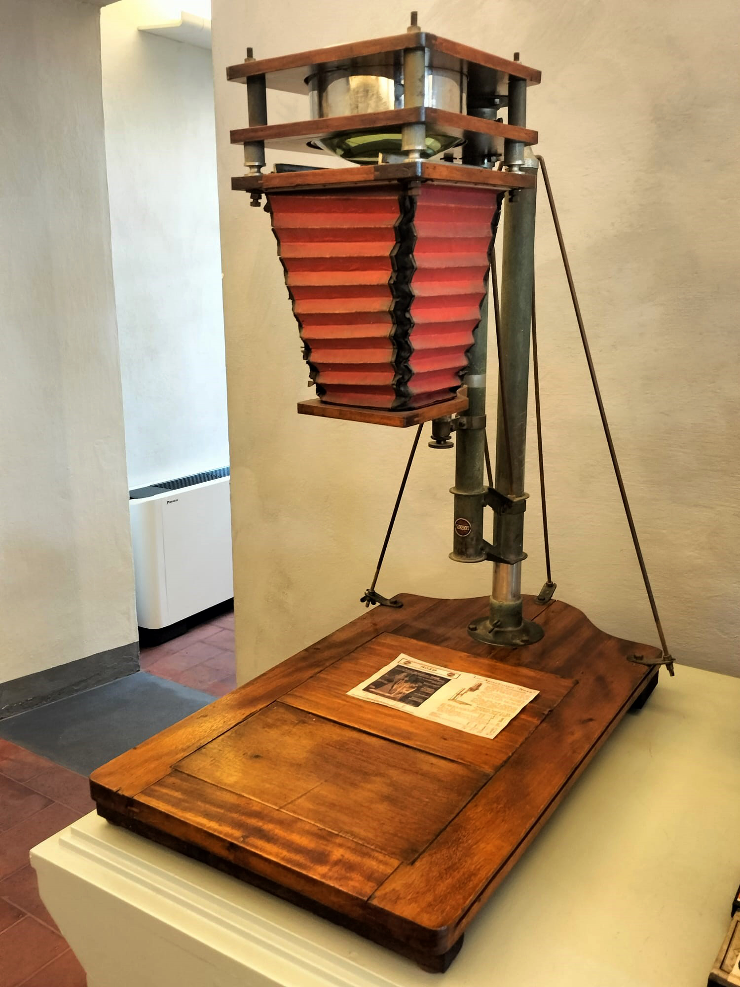 Dispositivo da appoggio costituito da un corpo superiore, collegato mediante una doppia colonna in metallo regolabile a un piano di lavoro in legno. La colonna è assicurata al piano tramite tre tiranti in metallo. Il corpo superiore è costituito da una lampada alimentata a corrente elettrica, di cui manca la calotta, con lente condensatrice e soffietto in tela estensibile, alla cui estremità era presente l’obiettivo, oggi mancante. Tra la lampada e il soffietto si trova l’alloggiamento per il negativo da ingrandire