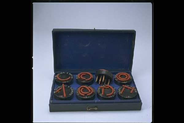 Elementi per conduzione elettrica in cassetta di cartone, 8 resistenze così contrassegnate: "1 I Elemento a Catena", "2 II Elemento a Catena","3 III Elemento a Catena", "4 IV Elemento a Catena", " 5 II Elemento a Colonna", "6 Colonna a II Coppie", "7 III Elemento a Colonna", "8 Colonna a IV Coppie"