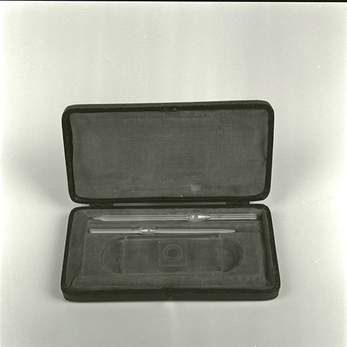 Contaglobuli o emocitometro di Thoma composto da una camera contaglobuli (vetrino) a da due pipette una da 0.25 cc e l'altra da 1 cc. Serie n. 4317, custodito in astuccio