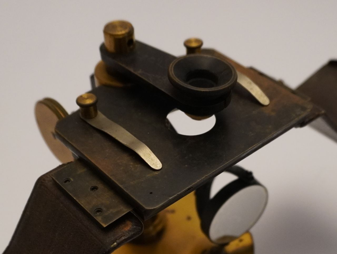 Stativo di preparazione con tavolino corredato di appoggiamani ricoperto di pelle, specchio amovibile, oculare con regolazione a vite e cremagliera per la messa a fuoco