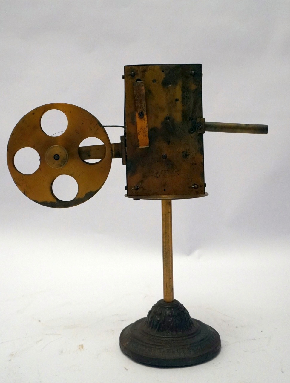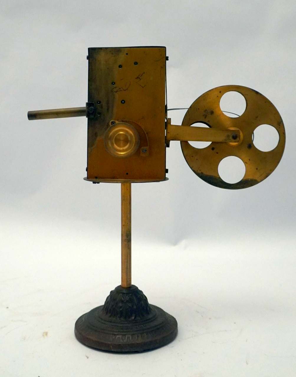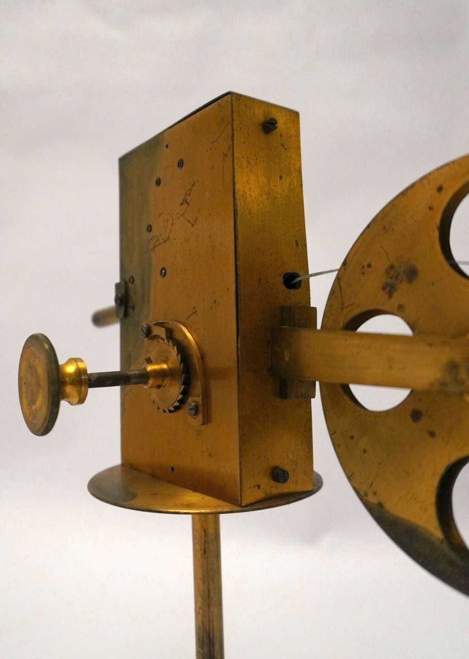 Su un piedistallo a base circolare poggia una scatolina rettangolare a cui è imperniata una puleggia e dalla parte opposta fuoriesce un tubo. Lateralmente una manopola di ricarica