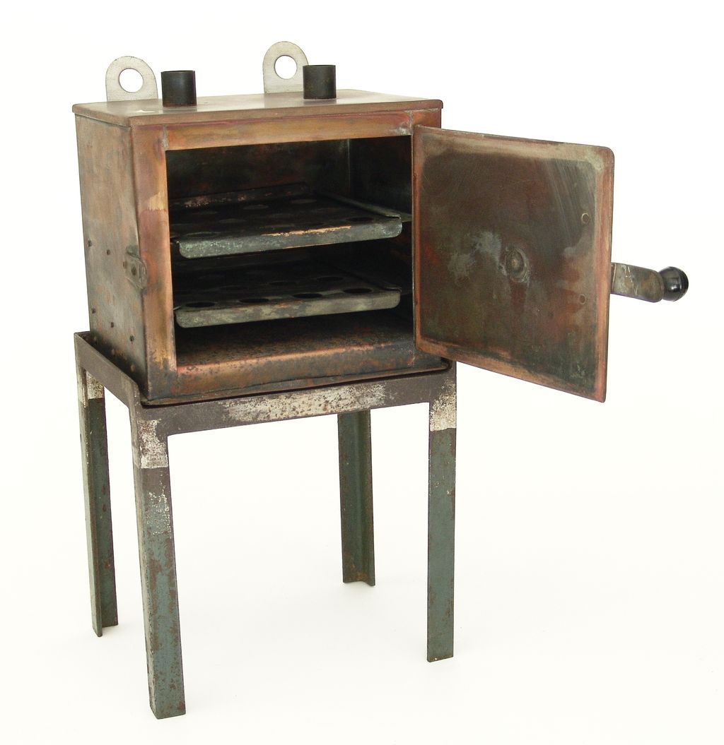 Stufa a secco in rame a due uscite munita di due ripiani forati, posta su un piedistallo di ferro con anelli appendi-muro. Sulla parete laterale a pennarello "940" e "1625" (cancellati)