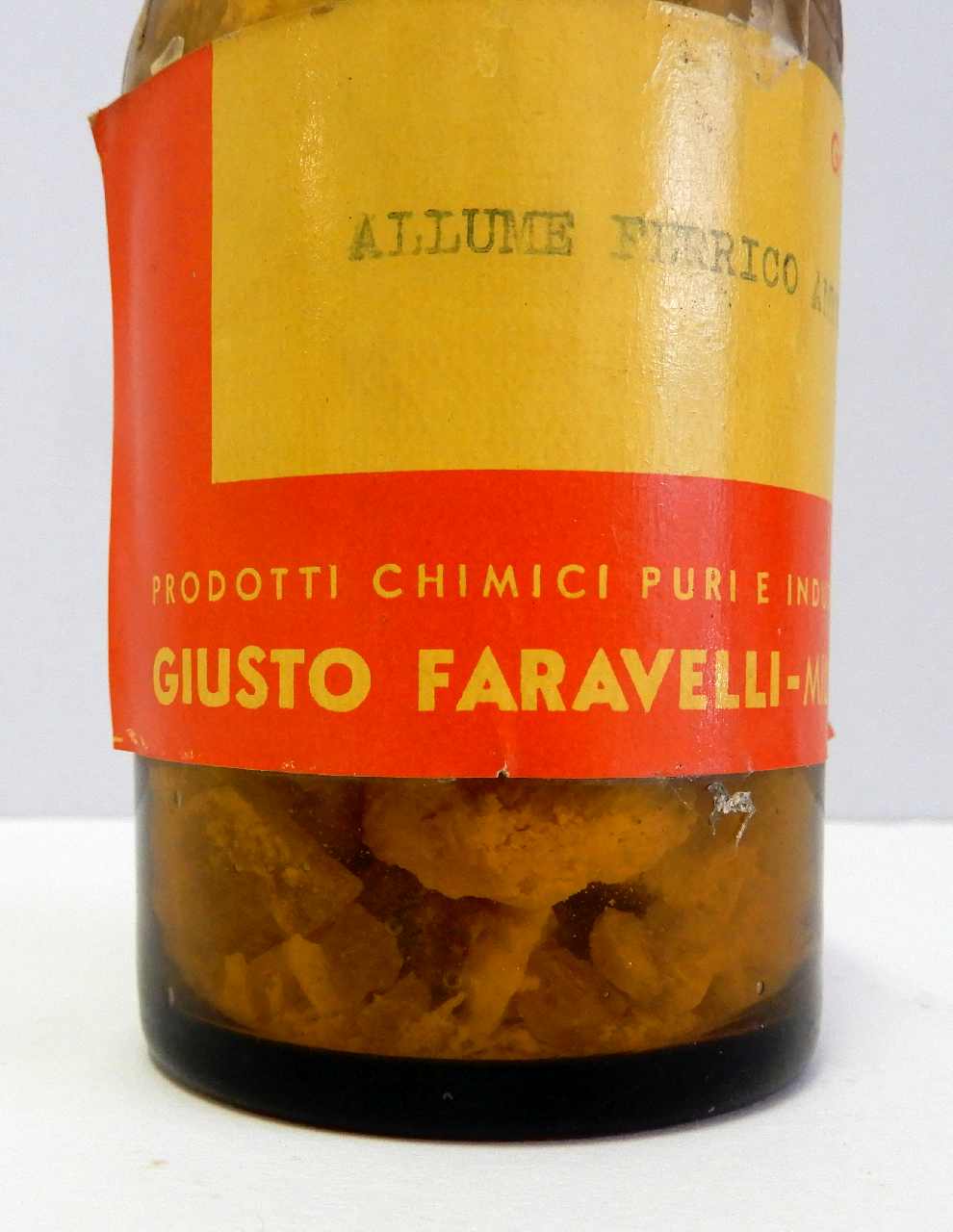 - ISCRIZIONI etichetta - Gr. 200 ALLUME FERRICO AMMONIACALE PRODOTTI CHIMICI PURI E INDUSTRIALI GIUSTO FARAVELLI - MILANO - stampatello - italiano