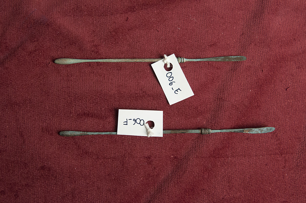 Gli strumenti presentano all'estremità una spatola, una più piatta e una più curva, a forma di cucchiaio. Lungo il corpo, poco prima delle estremità, sono presenti delle decorazioni. Alla base gli oggetti presentano un ingrossamento di forma olivare, probabilmente usato come innesto per assemblare la spatola a un manico e incrementarne la lunghezza