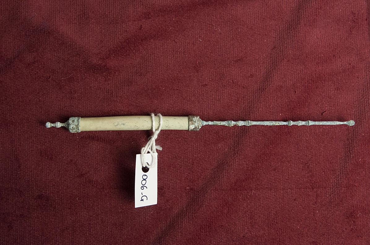 Su di un manico d'osso è fissato un gambo metallico dritto e sottile, che finisce alargandosi a forma di "osso d'oliva". Lungo il gambo sono presenti due gruppi da tre nodi decorativi. Alle estremità del manico sono fissate due fascette metalliche, apposte probabilmente in epoca successiva alla produzione, per irrobustire ed evitare la formazione di venature sull'osso
