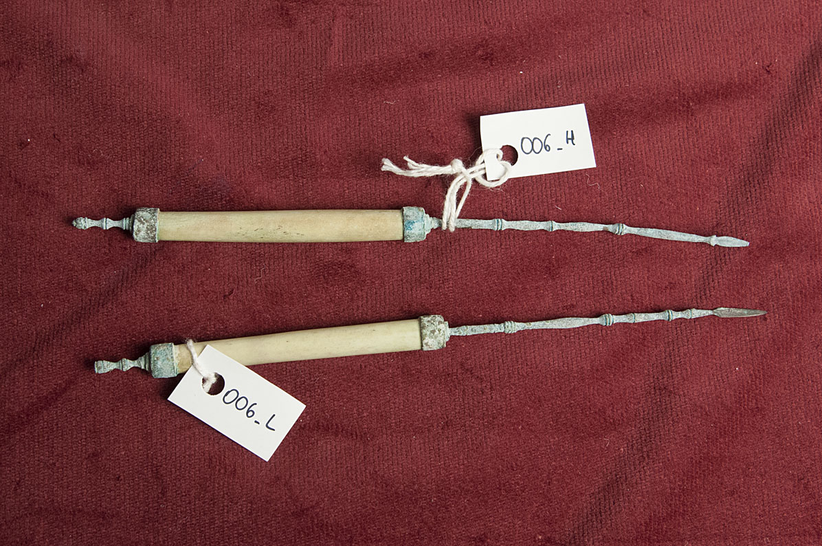 Su di un manico d'osso è fissato un gambo metallico dritto e sottile, che finisce in una lama a forma di foglia, tagliente su ambo i lati. Nel primo strumento la lama è più larga, nel secondo è più stretta. Lungo il gambo sono presenti dei nodi decorativi. Alle estremità del manico sono fissate due fascette metalliche, apposte probabilmente in epoca successiva alla produzione, per irrobustire ed evitare la formazione di venature sull'osso