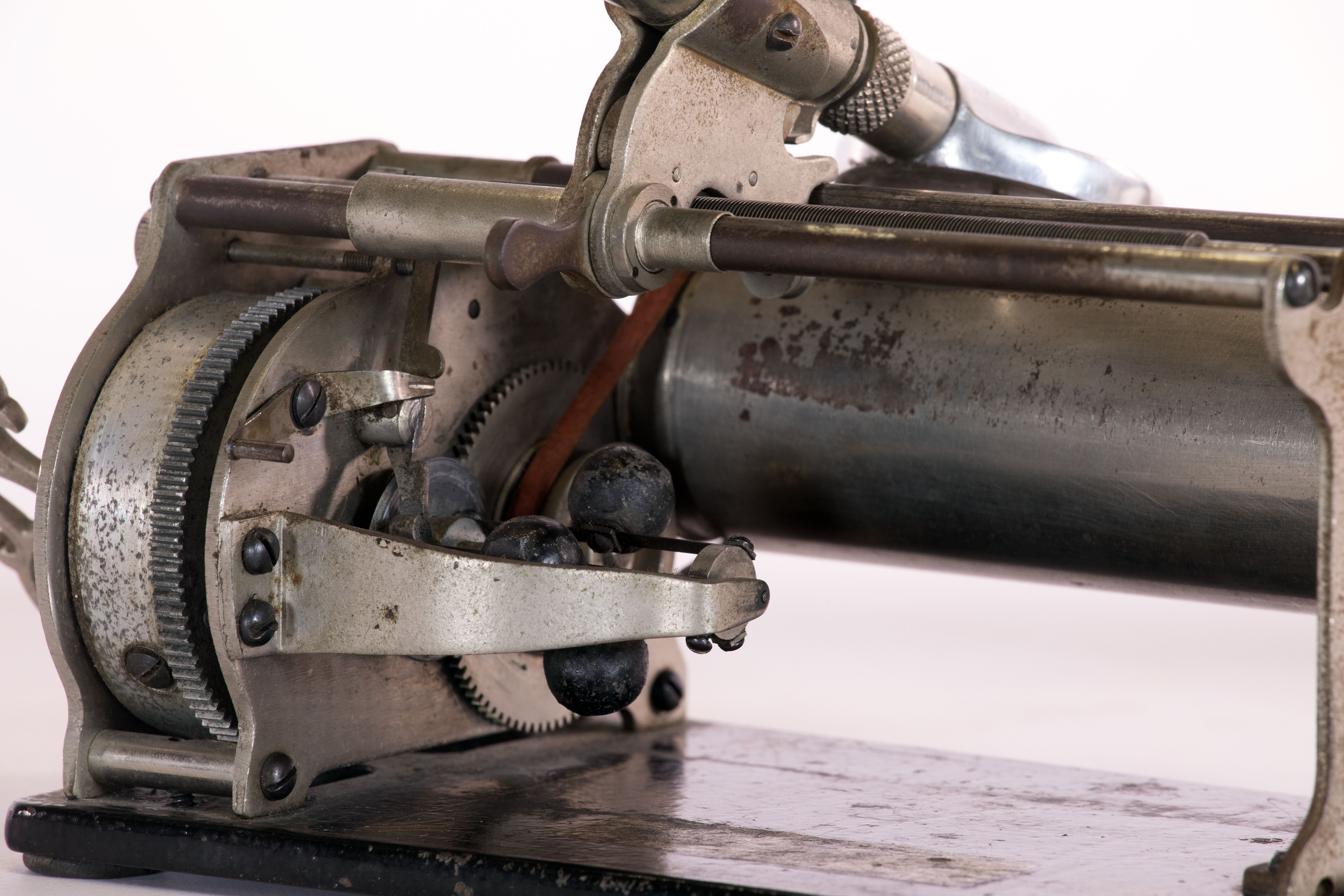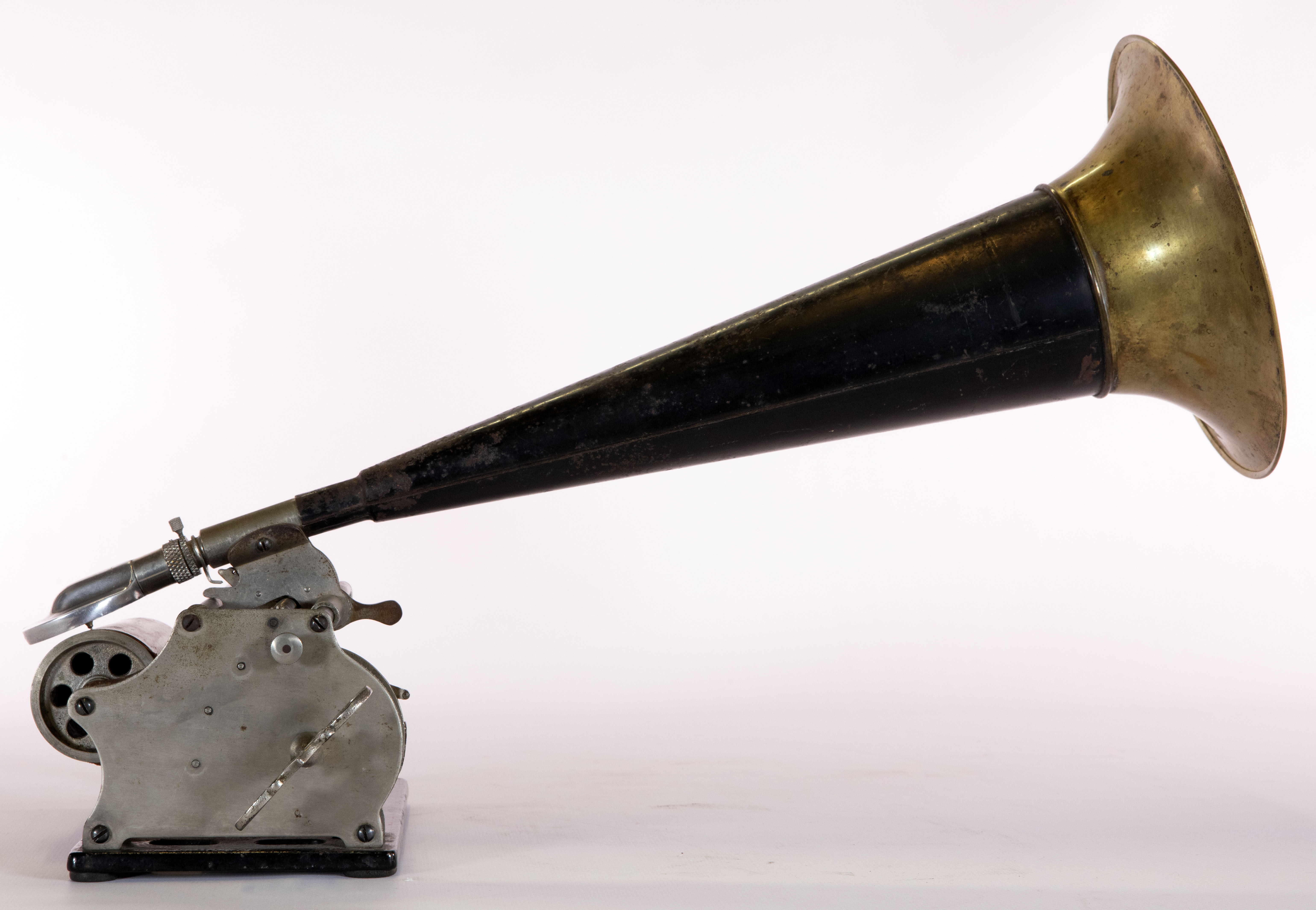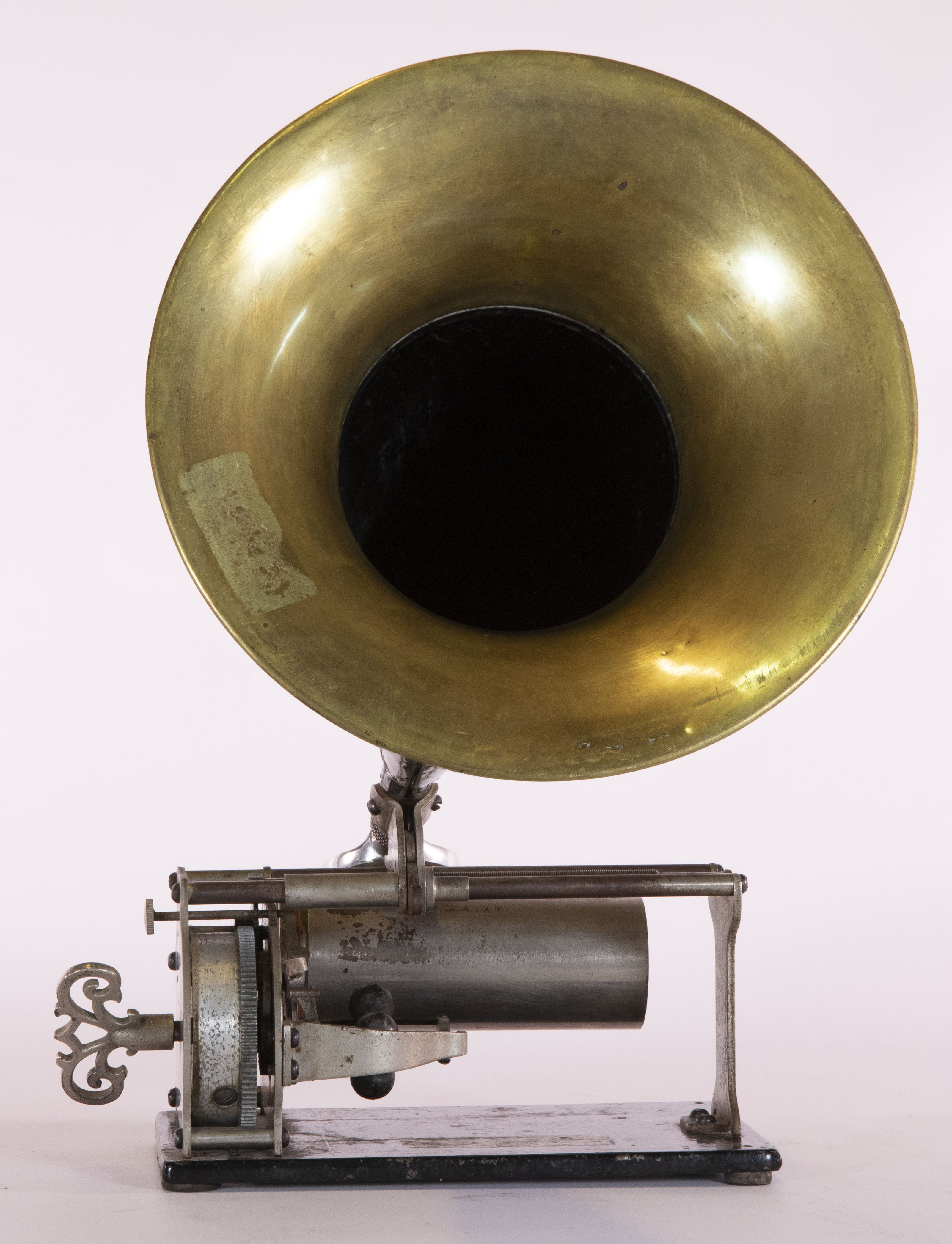 Contenitore: base di ferro verniciata in nero con decorazioni e marchio in oro. Sul lato sinistro della macchina è presente la chiave per la carica e la manopola per regolare la velocità. Motore: propulsione manuale a una molla con sistema di carica a chiave incorporata in metallo con decorazioni a ricciolo; stabilizzatore di velocità composto da tre sfere. Sistema di riproduzione del suono: diaframma con puntina in pietra dura connessa alla tromba in ottone a cappello di strega (modello B1) con cono verniciato nero e anello non verniciato. Modalità d’uso: fonografo meccanico con motore a molla caricato mediante una chiave inserita sul lato sinistro. Sollevare e spostare verso sinistra il supporto del diaframma, ruotare il braccetto di ritegno del mandrino ed inserire il cilindro, caricare il motore tramite l’apposita chiave, sbloccare il sistema di blocco e abbassare il diaframma in corrispondenza dell’inizio del solco inciso; inoltre, regolare la velocità di rotazione mediante la piccola manopola metallica posta sul lato sinistro. Le oscillazioni della puntina, prodotte dallo spessore irregolare dell'incisione, generano degli impulsi sonori che mettono in vibrazione la membrana del diaframma. Le vibrazioni riproducono il suono amplificato dalla tromba detta a cappello di strega