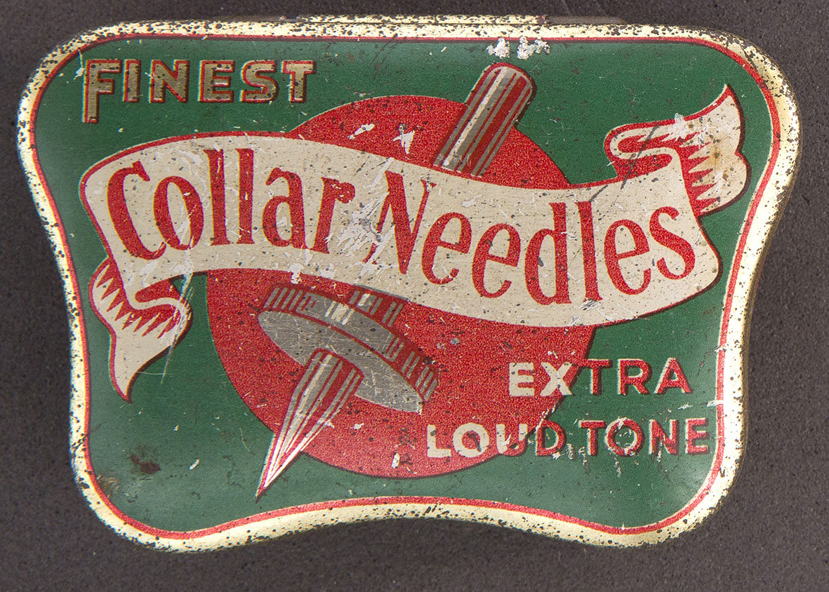 - NOTIZIE STORICO CRITICHE L’industria del suono riprodotto iniziò nel 1877 negli Stati Uniti quando Thomas Edison inventò una maniera di registrare il suono su un foglio di alluminio e di riprodurlo tramite una macchina che chiamò fonografo. Nel corso di una decina di anni, questo sistema venne notevolmente migliorato, prima con l’invenzione nel 1886 dei cilindri di cera Bell-Tainter e poi nel 1887 con l’invenzione del disco e l’adozione dell’incisione orizzontale fatta da Emile Berliner che non solo riproduceva il suono con molta più facilità ma rendeva anche la duplicazione molto più agevole. All’invenzione del disco Berliner accompagnò l’invenzione di una macchina per riprodurlo ovvero il grammofono che venne perfezionata nel 1896 da Eldridge R. Johnson con l’aggiunta del motore a molla. Le puntine fonografiche erano un accessorio fondamentale per il buon funzionamento di un grammofono. Era necessario cambiarle regolarmente per evitare di rovinare il solco dei dischi e venivano vendute in scatole da 100, 200 o anche più pezzi. Prodotte in acciaio, ne esistono di varie tipologie a seconda di come ne veniva modellata la punta. La differenza tra una puntina e l’altra veniva individuata nel “tono” o meglio nel volume della riproduzione: a seconda della forma della testa di una puntina che poteva essere più o meno affilata, era possibile ottenere una resa del suono dal tono più o meno “morbido” o più o meno “forte”. Le puntine, quindi, venivano vendute e pubblicizzate a seconda della loro qualità di riproduzione e venivano spesso prodotte dalle stesse aziende produttrici di dischi. Venivano vendute principalmente in scatoline di latta di varie dimensioni ma esistevano anche diverse tipologie di confezioni in carta. Le scatoline nelle quali venivano confezionate le puntine sono un soggetto di grande interesse per i collezionisti. In questa scheda sono descritte cinque scatoline di grandi dimensioni rettangolari e di quattro marchi differenti: due Aegir, una per il mercato tedesco e una per il mercato spagnolo, una Ondulette, una Elephant e una Collar Needles. Il termine “pick-up” che spesso ricorre sulle confezioni delle scatoline era una maniera alternativa di chiamare le puntine in inglese (al posto di “needle”)