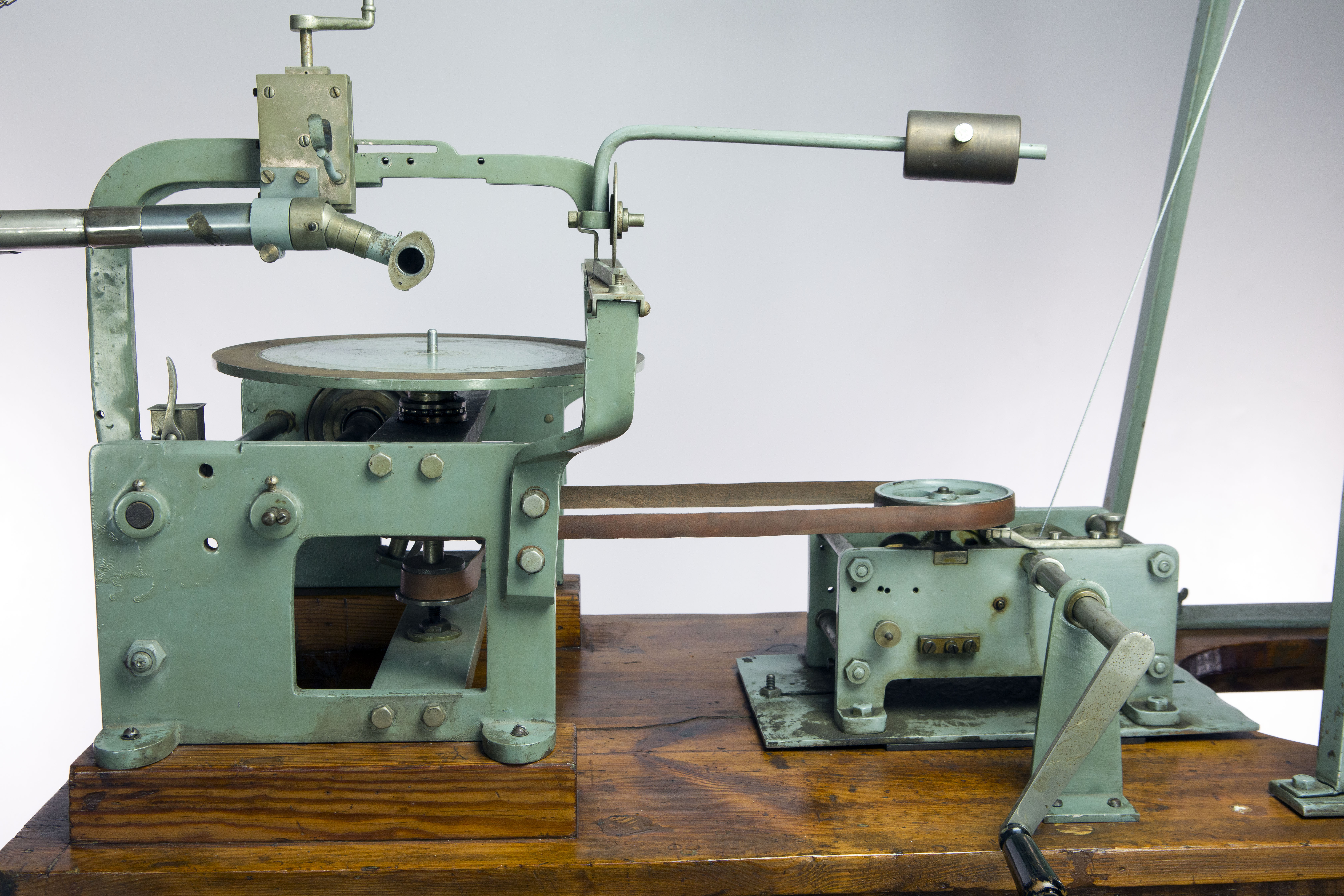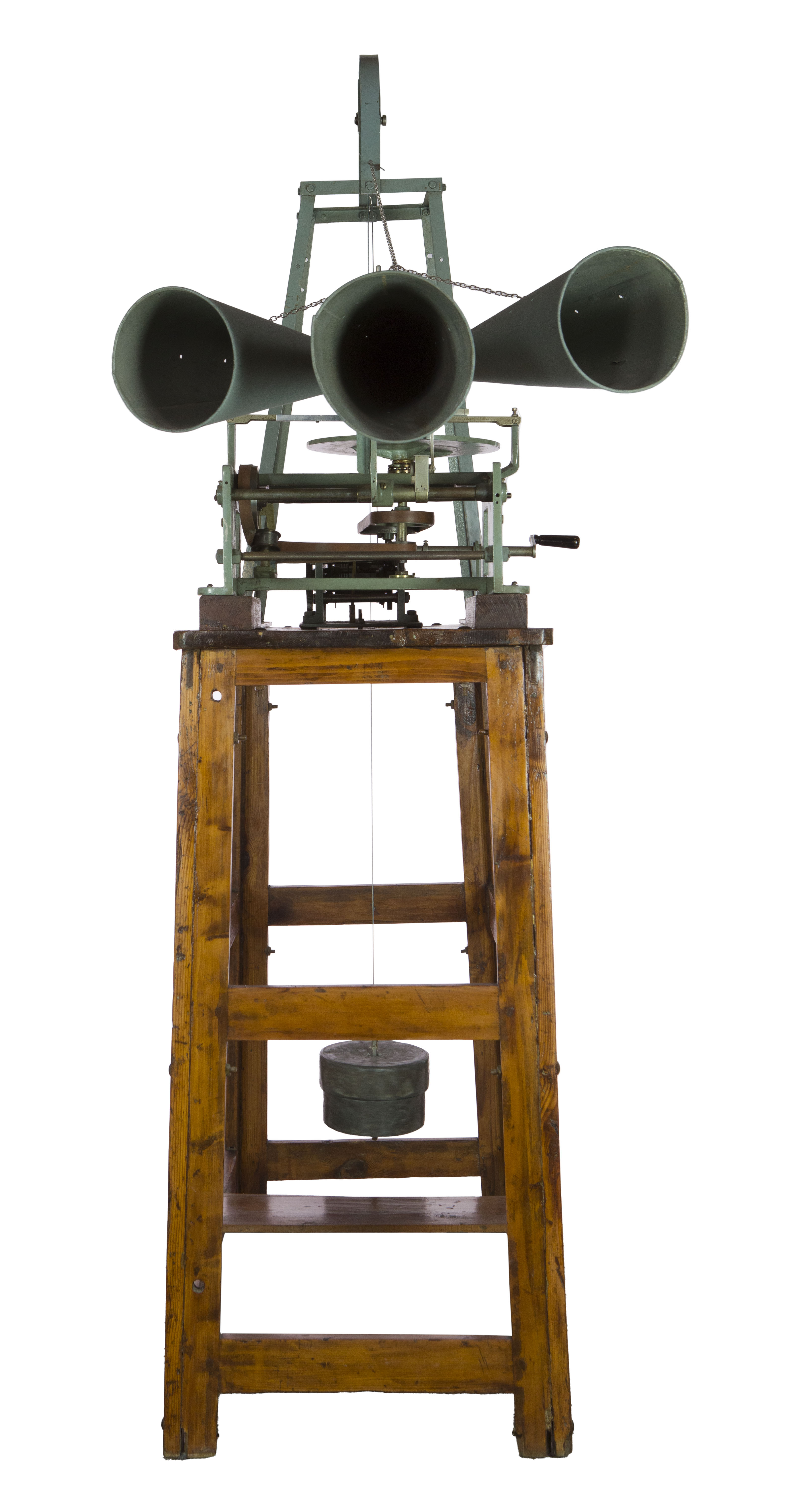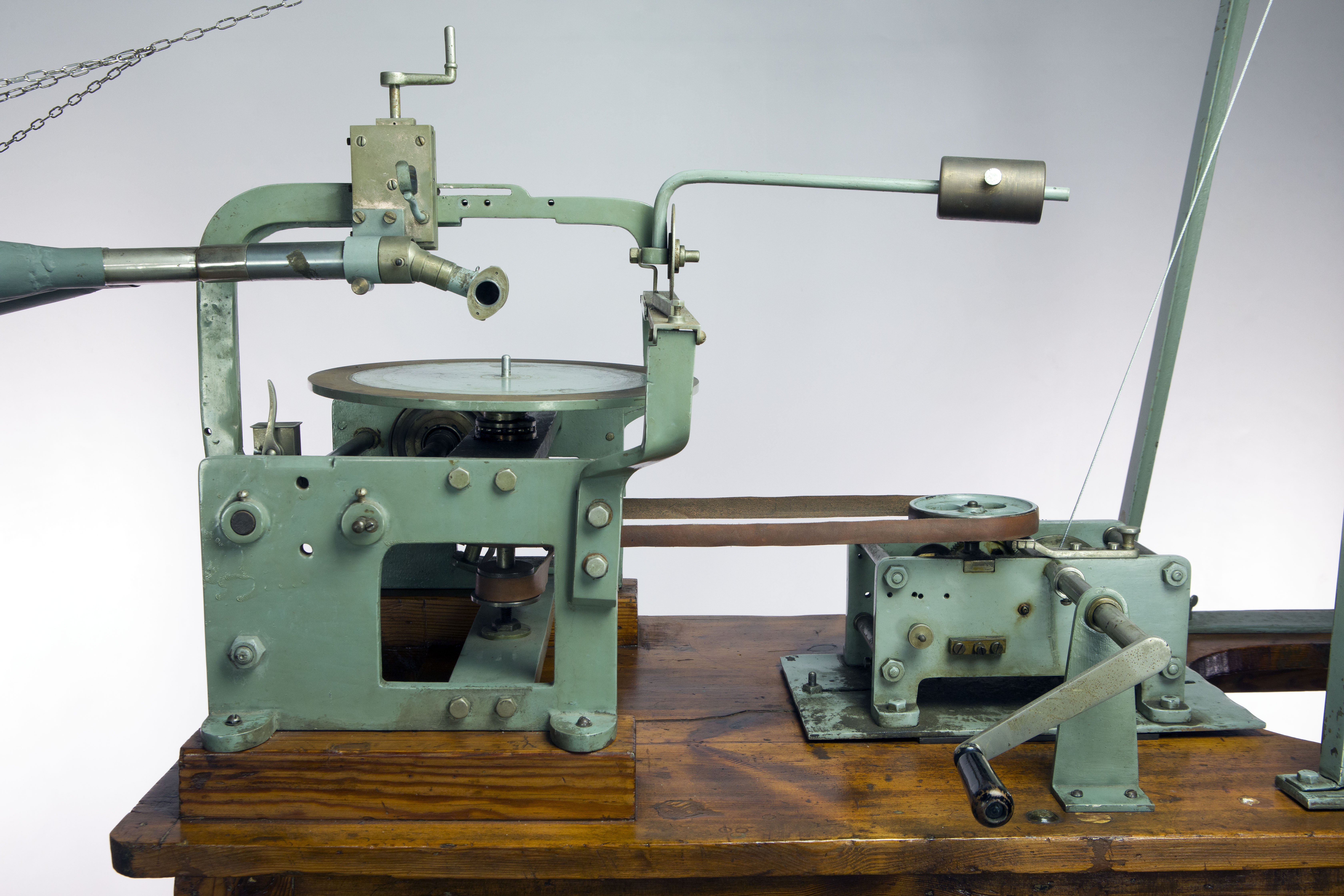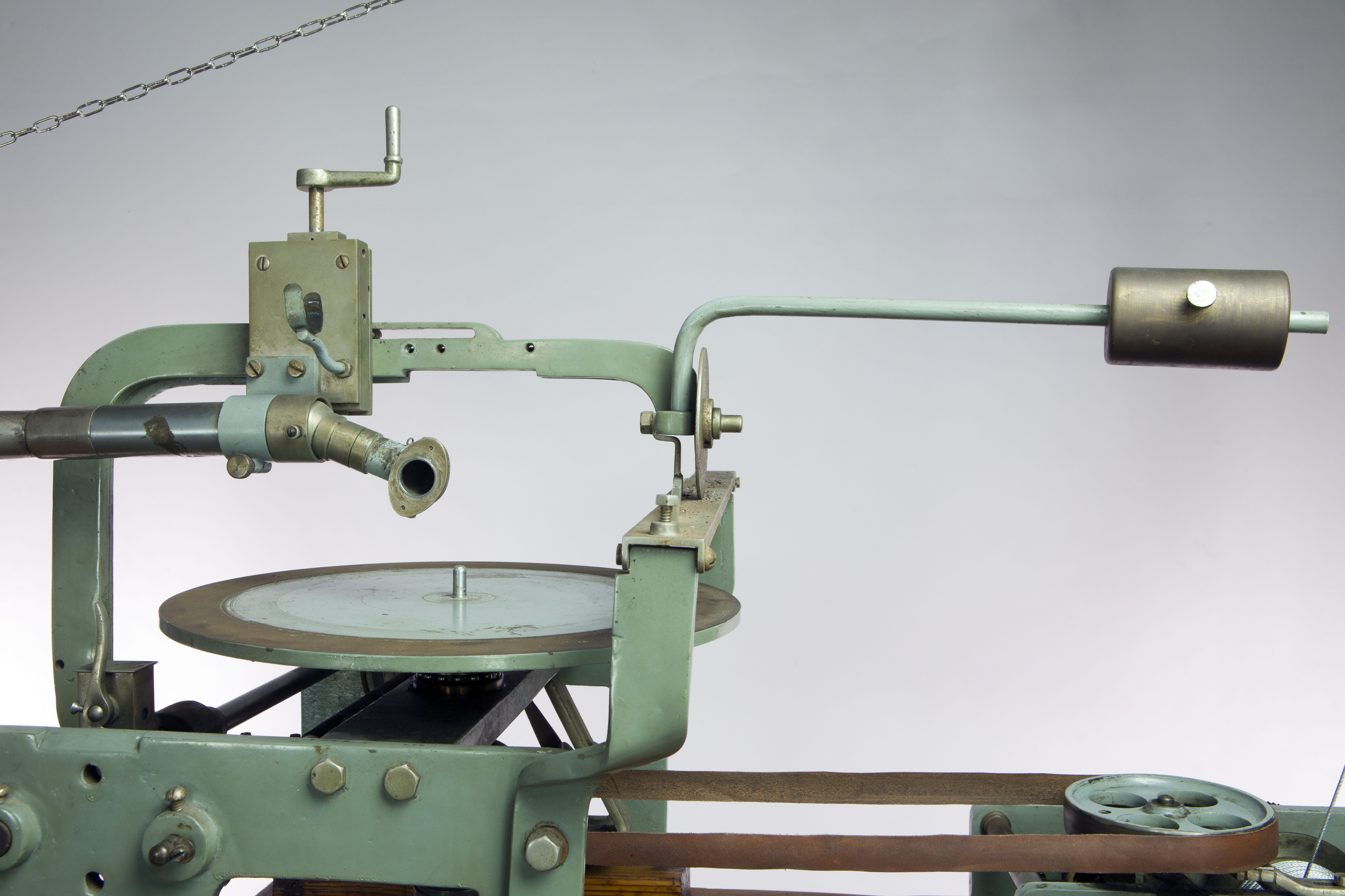 Contenitore: la macchina, in metallo smaltato, è fissata ad un cavalletto rettangolare in legno. E’ composta da un sistema, con carica a manovella e contrappeso, che aziona, tramite una ruota di trasmissione su cui scorre una fascia di cuoio, l’ingranaggio per la rotazione del piatto sotto al braccio incisore, a sua volta collegato alle trombe acustiche. Attraverso la calibratura del cilindro metallico che funge da contrappeso, viene regolata la forza del braccio incisore su cui è fissato il diaframma (assente): la stabilità e la precisione di questi elementi influiscono direttamente sulla qualità dell’incisione. Il contrappeso, regolato accuratamente, ha il compito di mantenere stabile la testina, assicurando una pressione costante sulla punta di incisione: ciò permette di ottenere un solco netto e preciso sul disco di cera. La macchina è dotata di due attacchi metallici a due e a tre trombe e di tre trombe in ottone e tre in metallo smaltato. Funzione: fonoincisore di matrici in cera, per la produzione di dischi fonografici. Motore: motore a tre masse cilindriche e sistema di regolazione della velocità a vite. Modalità d’uso: caricando la manovella, si manovra un sistema a carrucola e peso a piombo; il cavo metallico si avvolge attorno al mandrino e il contrappeso, costituito da due dischi di piombo sostenuti dal cavo, da 15 kg ciascuno, viene sollevato. Azionare il sistema di blocco costituito da un’asta in metallo presente al di sopra del mandrino, calibrare il contrappeso che regola la forza della testina, posizionare il disco di cera sul piatto e la macchina è pronta per procedere con l’incisione. Sbloccare il freno e il piatto inizia a ruotare. Accompagnare il diaframma con la puntina da incisione sul disco di cera; la puntina, solitamente una punta di diamante, converte le vibrazioni sonore captate e amplificate dalla tromba, in movimenti meccanici che incidono il solco sulla superficie del disco. Modalità d’uso: Il disco di cera deve essere pulito con attenzione. Una volta preparato tutto, si procede alla fase di regolazione dell'incisore, con particolare cura per la taratura del contrappeso e della testina di incisione. Questo passaggio è cruciale, poiché la stabilità e la precisione di questi componenti influiscono direttamente sulla qualità dell’incisione. Il contrappeso, regolato accuratamente, ha il compito di mantenere stabile la testina, assicurando una pressione costante sulla punta di incisione. Ciò permette di ottenere un'incisione netta e precisa sul disco di cera. Per inserire il disco, posizionarlo nel mandrino sull'apposito piatto; quindi ruotare la manovella per la carica e disinnescare il sistema di blocco. Accompagnare il diaframma con la puntina da incisione sul disco, permettendo alla puntina di incidere la superficie del disco di cera grazie alle vibrazioni sonore captate dalle tre trombe. Il processo di incisione inizia con il trasferimento del segnale audio al dispositivo, che lo elabora e amplifica, per poi inviarlo alla testina di incisione. Quest'ultima, solitamente dotata di una punta di diamante, converte le vibrazioni sonore in movimenti meccanici. Infine, rifinire il lavoro eventualmente levigando la superficie del disco per assicurare una riproduzione audio di alta qualità