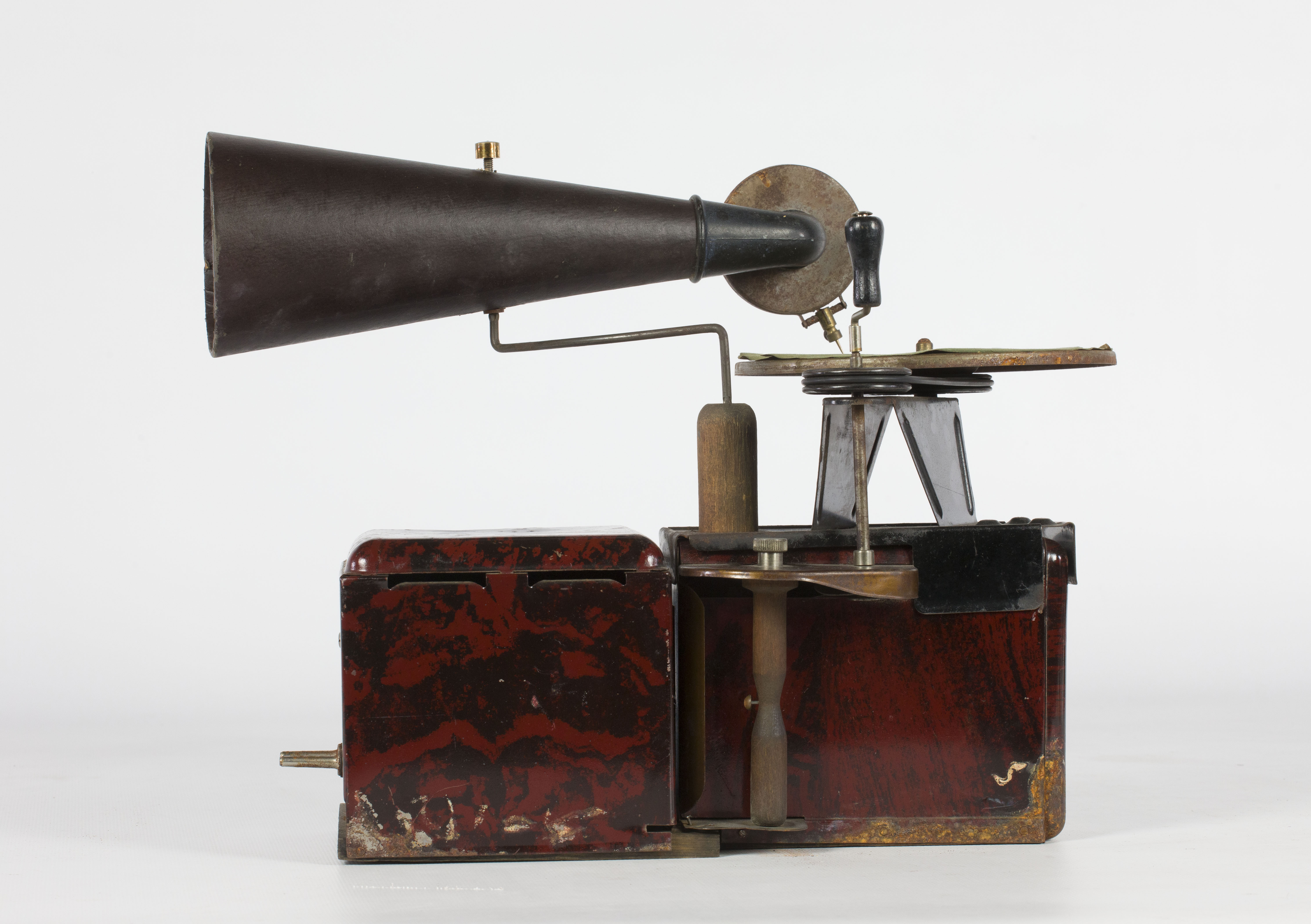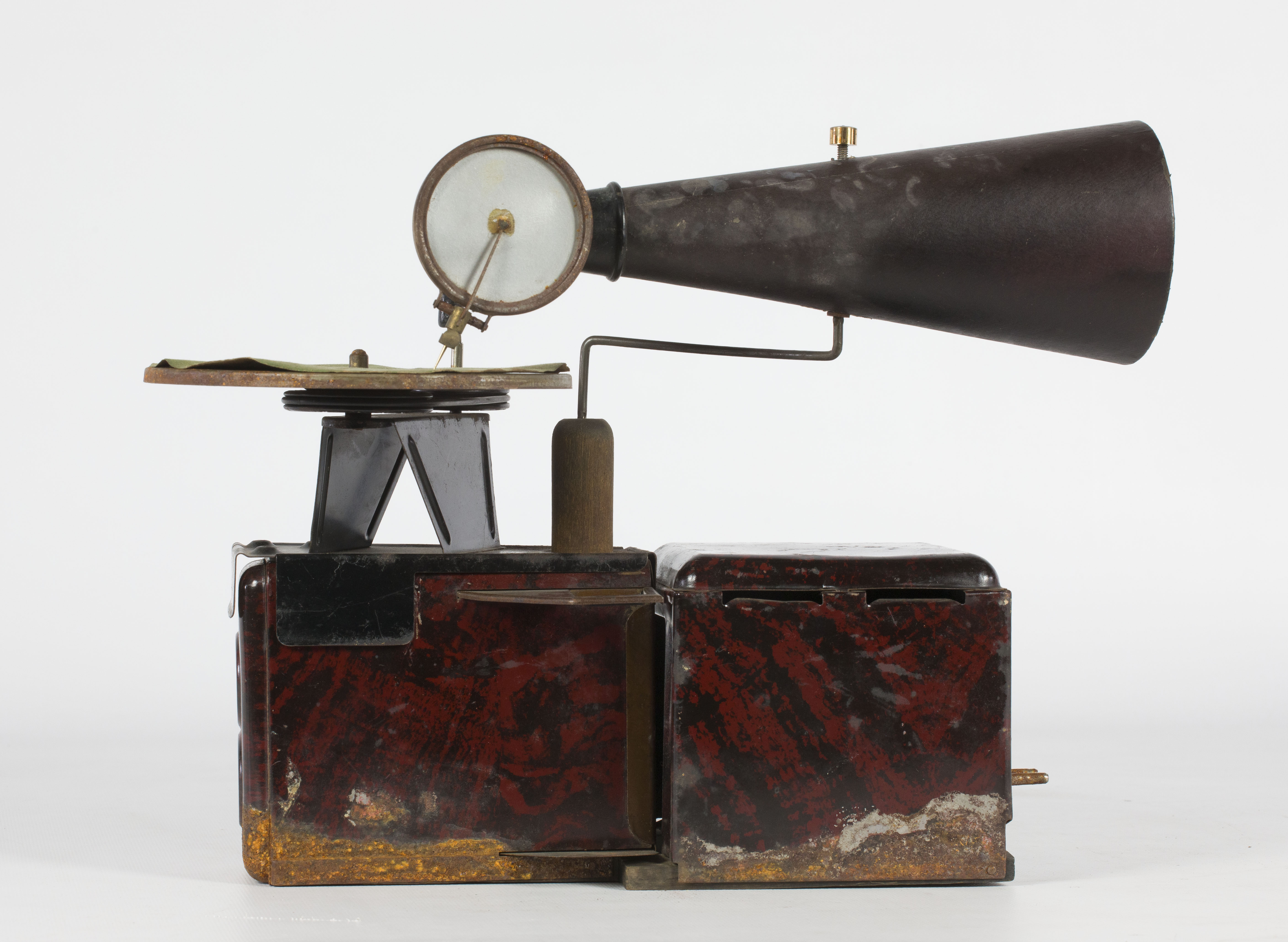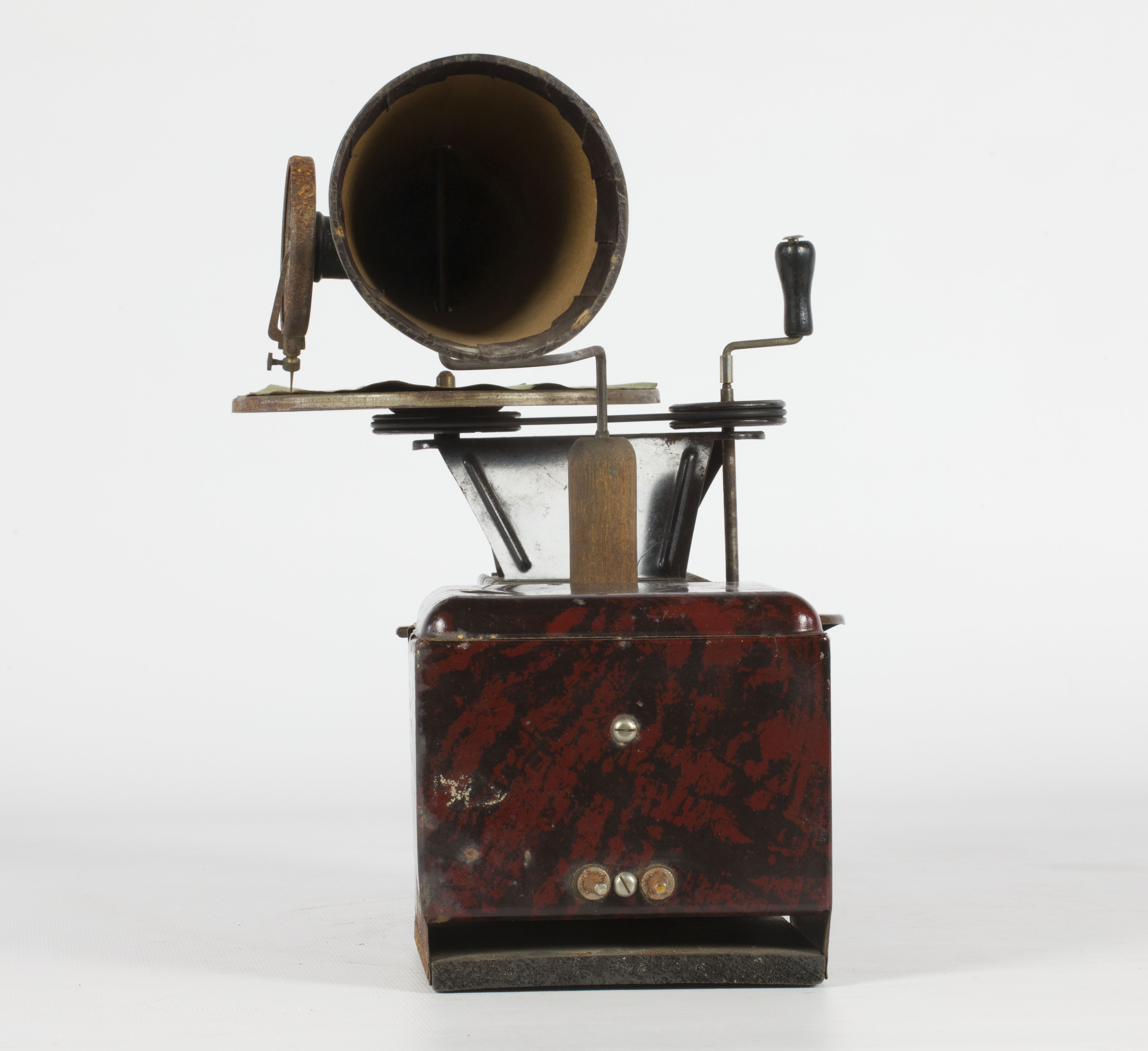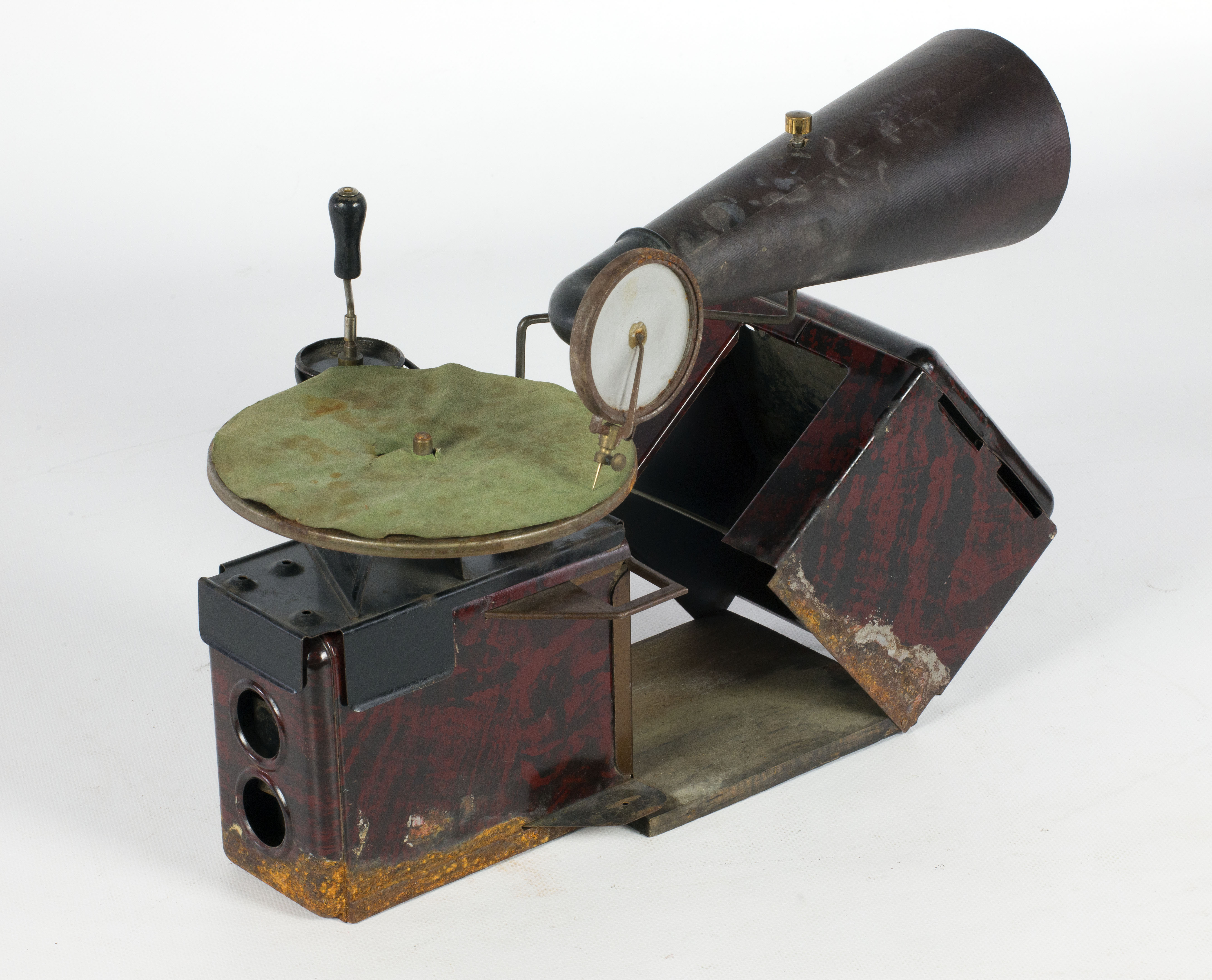 - NOTIZIE STORICO CRITICHE L’industria del suono riprodotto iniziò nel 1877 negli Stati Uniti quando Thomas Edison inventò una maniera di registrare il suono su un foglio di alluminio e di riprodurlo tramite una macchina che chiamò fonografo. Nel corso di una decina di anni, questo sistema venne notevolmente migliorato, prima con l’invenzione nel 1886 dei cilindri di cera Bell-Tainter e poi nel 1887 con l’invenzione del disco e l’adozione dell’incisione orizzontale fatta da Emile Berliner che non solo riproduceva il suono con molta più facilità ma rendeva anche la duplicazione molto più agevole. Parallelamente al settore della registrazione del suono andava sviluppandosi il settore della fotografia e il settore cinematografico. Intorno alla fine degli anni Venti e i primi anni Trenta, grazie al perfezionamento delle tecniche di produzione di motori e diaframmi e agli studi sull'amplificazione acustica, cominciarono a comparire sul mercato modelli di grammofono portatili ma anche molti modelli giocattolo per i bambini. Il caso del modello presentato in questa scheda vede montati insieme un proiettore di immagini e un piccolo grammofono per la riproduzione del sonoro