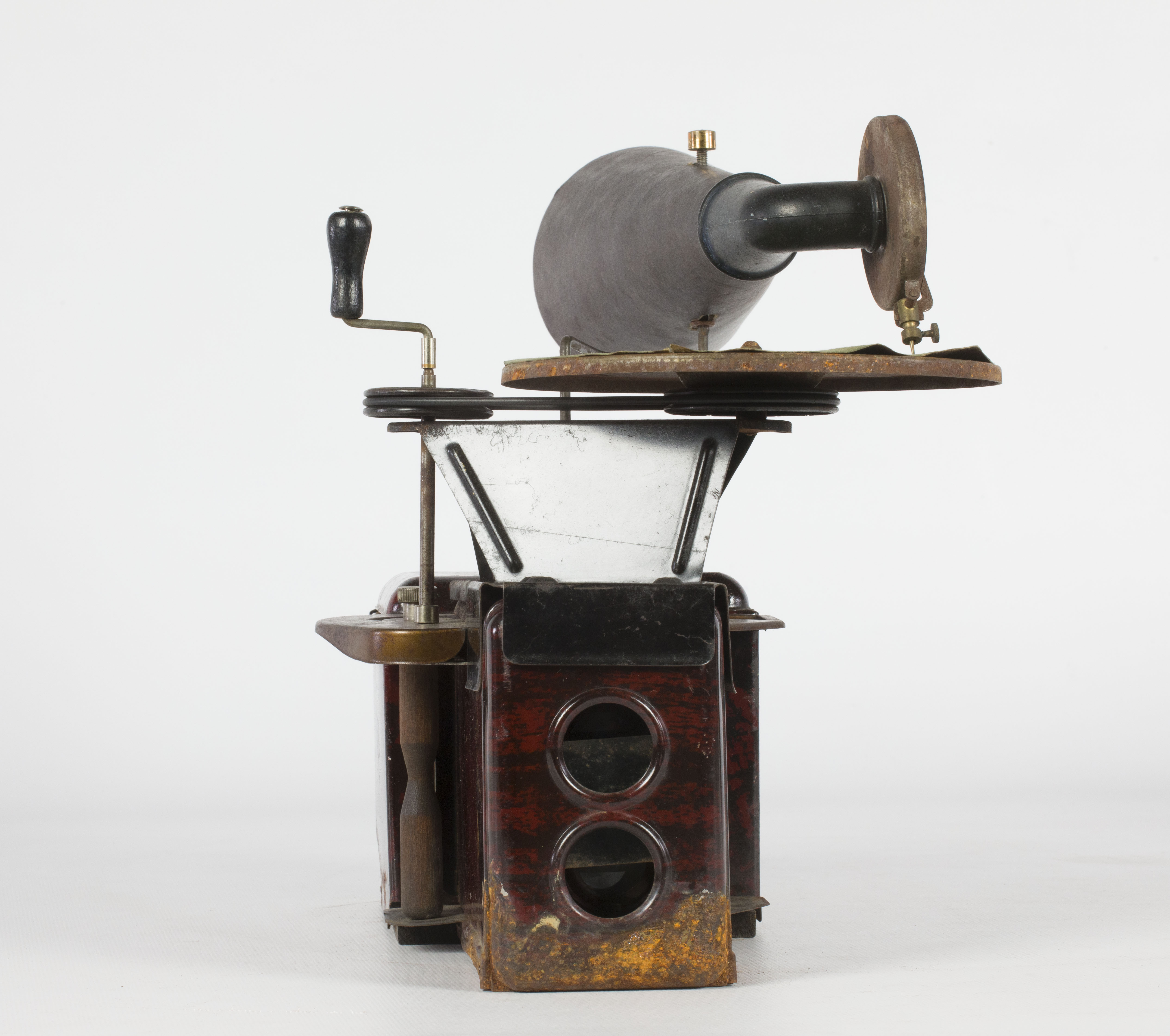 Contenitore: scatola rettangolare in metallo smaltata di colore rosso borgogna sul cui lato frontale è installato l’obiettivo per la proiezione delle immagini. La scatola rettangolare è vuota e reclinabile per l'inserimento della lampadina per la proiezione delle immagini mentre al di sopra dell’obiettivo è installato, su due supporti in metallo, il piatto del disco per la riproduzione del sonoro e un supporto in legno su cui è inserita un’asta di metallo per il sostegno della tromba acustica. Sul lato sinistro è presente l’alloggiamento per il rullo del filmino in carta velina connesso alla manovella su cui è montato la ruota collegata al piatto del disco tramite una corda in plastica che consente la messa in movimento sia del piatto del disco che dell'alloggiamento per il filmino in carta velina. Motore: propulsione manuale con sistema di carica a manovella; un’unica manovella sia per il grammofono che per lo scorrimento del filmino di carta velina. Sistema di riproduzione del suono: piccola tromba in latta connessa ai diaframma. Modalità d’uso: proiettore con sonoro. Inserire all’interno della scatola una sorgente luminosa; posizionare il proiettore da tavolo di fronte ad un muro bianco o a un telo, inserire il filmino in carta velina nell’apposito alloggiamento, srotolarlo e fissarlo all’interno dell’apposito vano. Collocare il disco inciso sul piatto, appoggiare sul disco la puntina o stilo del diaframma (dall’esterno all’interno). Attraverso la rotazione manuale della manovella viene messa in rotazione il rullo del filmino e, allo stesso tempo, la rotazione del piatto del disco; la puntina inizia a scorrere all'interno del solco a spirale inciso sul disco e le oscillazioni della puntina, prodotte dal profilo irregolare dell'incisione, vengono trasmesse al diaframma e alla piccola tromba in metallo che ne amplifica il suono