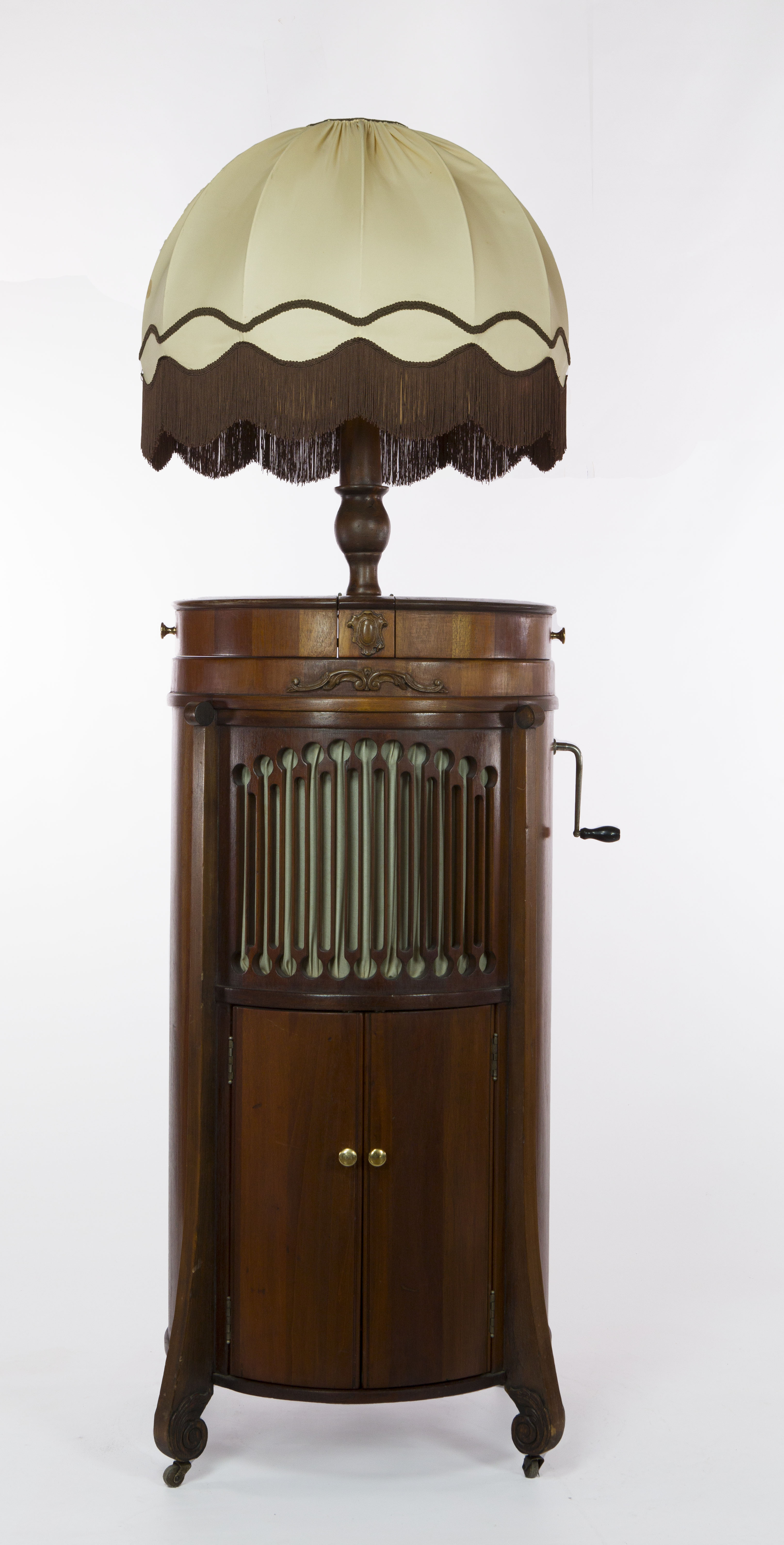 - NOTIZIE STORICO CRITICHE L’industria del suono riprodotto iniziò nel 1877 negli Stati Uniti quando Thomas Edison inventò una maniera di registrare il suono su un foglio di alluminio e di riprodurlo tramite una macchina che chiamò fonografo. Nel corso di una decina di anni, questo sistema venne notevolmente migliorato, prima con l’invenzione nel 1886 dei cilindri di cera Bell-Tainter e poi nel 1887 con l’invenzione del disco e l’adozione dell’incisione orizzontale fatta da Emile Berliner che non solo riproduceva il suono con molta più facilità ma rendeva anche la duplicazione molto più agevole. All’invenzione del disco Berliner accompagnò l’invenzione di una macchina per riprodurlo ovvero il grammofono che venne perfezionata nel 1896 da Eldridge R. Johnson con l’aggiunta del motore a molla. La commercializzazione di massa del grammofono crebbe esponenzialmente proprio grazie alle novità apportate da Johnson e nacquero le prime società interessate a questo tipo di commercio. Il modello di grammofono descritto in questa scheda è stato prodotto dalla società Modernola Co. Inc. fondata all’inizio degli anni Venti a Johnstown in Pennsylvania. Il modello di grammofono presentato in questa scheda rappresenta un interessante esempio di grammofono detto “a consolle”. Con il termine consolle si fa riferimento ad un tipo di grammofono il cui meccanismo viene nascosto all’interno di un mobile avente anche altre funzioni. Si differenzia dal termine cabinet Ne vennero prodotti diversi modelli sia da tavolo ma soprattutto mobili cabinet con cui si fa riferimento ad un tipo di grammofono grande come un mobile ma avente l’unica funzione di contenere un grammofono. Il grammofono consolle presentato in questa scheda funge sia da grammofono che da lampada