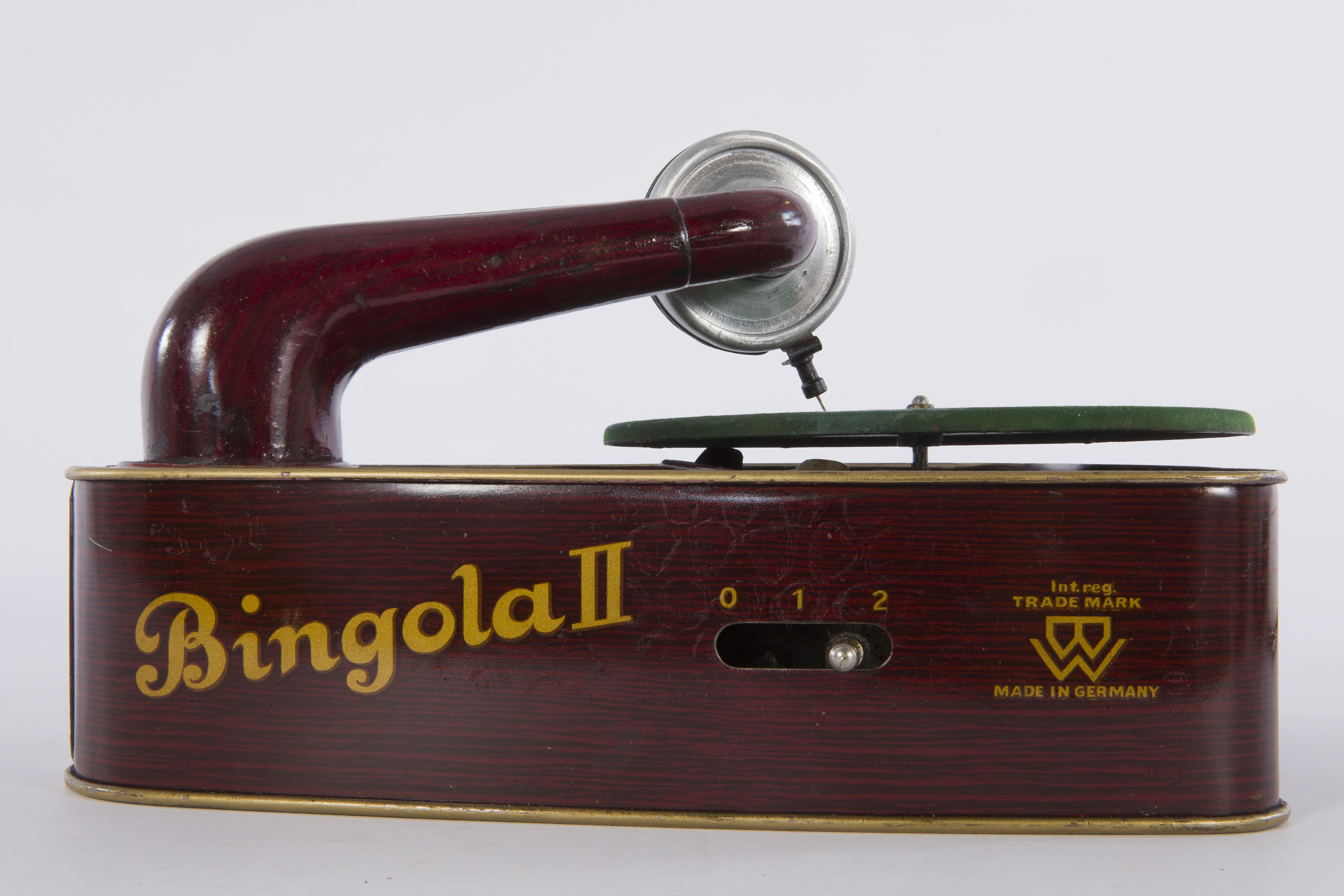- NOTIZIE STORICO CRITICHE L’industria del suono riprodotto iniziò nel 1877 negli Stati Uniti quando Thomas Edison inventò una maniera di registrare il suono e di riprodurlo tramite una macchina che chiamò fonografo. Nel corso di una decina di anni, questo sistema venne notevolmente migliorato, prima con l’invenzione nel 1886 dei cilindri di cera Bell-Tainter e poi nel 1887 con l’invenzione del disco e l’adozione dell’incisione orizzontale fatta da Emile Berliner che non solo riproduceva il suono con molta più facilità ma rendeva anche la duplicazione molto più agevole. All’invenzione del disco Berliner accompagnò l’invenzione di una macchina per riprodurlo ovvero il grammofono che venne perfezionata nel 1896 da Eldridge R. Johnson con l’aggiunta del motore a molla. Le prime applicazione del fonografo si rivolsero prima al mondo del lavoro, in particolare nel 1887 Edison fondò la “Edison Phonograph Co.” per la produzione e la vendita di dittafoni, e poi al mondo dei giocattoli quando Edison lanciò sul mercato la prima bambola dotata di un piccolo fonografo montato all’interno del busto che le consentiva di parlare. L’invenzione della registrazione del suono applicata al mondo dei bambini si palesa, quindi, fin dai suoi albori. Agli inizi degli anni Venti del Novecento, grazie al perfezionamento delle tecniche di produzione di motori e diaframmi e agli studi sull'amplificazione acustica, cominciarono a comparire sul mercato dei piccoli grammofoni giocattolo realizzati in latta. Il modello presentato in questa scheda è stato prodotto dall’azienda tedesca Bing Werke. La Bing Werke BW fu un’azienda tedesca, fondata a Norimberga nel 1866 dai fratelli Ignaz e Aldof Bing, che produceva e commerciava in utensili per la casa e soprattutto giocattoli. Famosa per la sua produzione di trenini giocattolo, realizzò diversi modelli di grammofono in latta per i bambini. Uno dei modelli di maggior successo era il modello Bingola, del quale esistono più versioni. Il grammofono giocattolo Bingola II descritto in questa scheda, venne prodotto tra la fine degli anni Venti e gli inizi degli anni Trenta. Si distingue dal modello Bingola I soprattutto per il braccio acustico caratterizzato da una forma conica e ricurva, mentre nel Bingola I il braccio acustico presenta una forma spezzata all’altezza del collo. Inoltre, il Bingola II è di dimensioni leggermente più grandi rispetto al Bingola I che ha una cassa più piccola e una forma più compatta. Sui grammofoni giocattolo Bingola era possibile riprodurre piccoli dischi da 15 o 18 cm