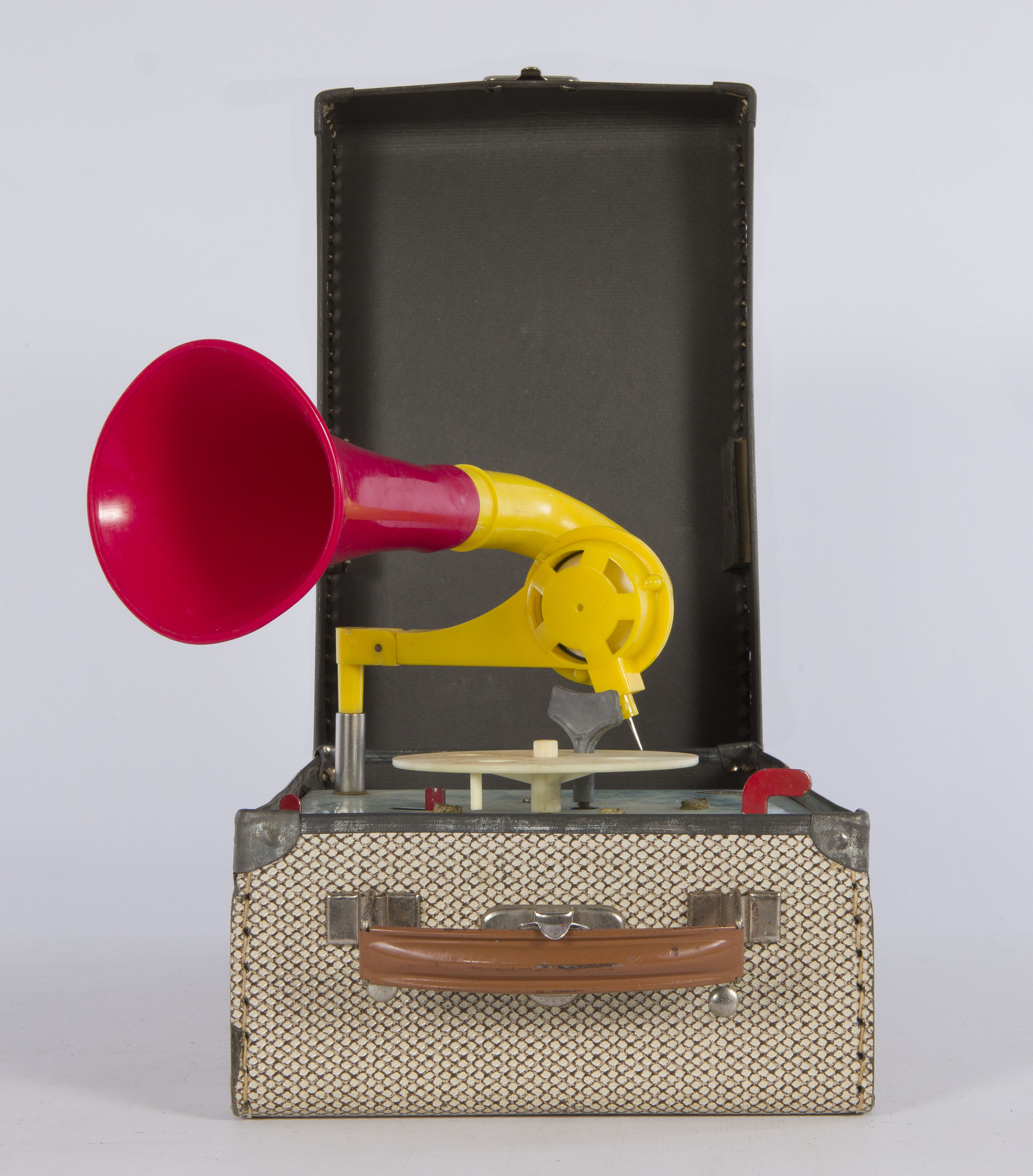 - NOTIZIE STORICO CRITICHE L’industria del suono riprodotto iniziò nel 1877 negli Stati Uniti quando Thomas Edison inventò una maniera di registrare il suono e di riprodurlo tramite una macchina che chiamò fonografo. Nel corso di una decina di anni, questo sistema venne notevolmente migliorato, prima con l’invenzione nel 1886 dei cilindri di cera Bell-Tainter e poi nel 1887 con l’invenzione del disco e l’adozione dell’incisione orizzontale fatta da Emile Berliner che non solo riproduceva il suono con molta più facilità ma rendeva anche la duplicazione molto più agevole. All’invenzione del disco Berliner accompagnò l’invenzione di una macchina per riprodurlo ovvero il grammofono che venne perfezionata nel 1896 da Eldridge R. Johnson con l’aggiunta del motore a molla. Le prime applicazione del fonografo si rivolsero prima al mondo del lavoro, in particolare nel 1887 Edison fondò la “Edison Phonograph Co.” per la produzione e la vendita di dittafoni, e poi al mondo dei giocattoli quando Edison lanciò sul mercato la prima bambola dotata di un piccolo fonografo montato all’interno del busto che le consentiva di parlare. L’invenzione della registrazione del suono applicata al mondo dei bambini si palesa, quindi, fin dai suoi albori. Agli inizi degli anni Venti del Novecento, grazie al perfezionamento delle tecniche di produzione di motori e diaframmi e agli studi sull'amplificazione acustica, cominciarono a comparire sul mercato dei piccoli grammofoni giocattolo realizzati in latta. Il modello di grammofono presentato in questa scheda è stato prodotto con molta probabilità dall’azienda di giocattoli inglese The Chad Valley Company Ltd., uno dei principali produttori di giocattoli in Regno Unito