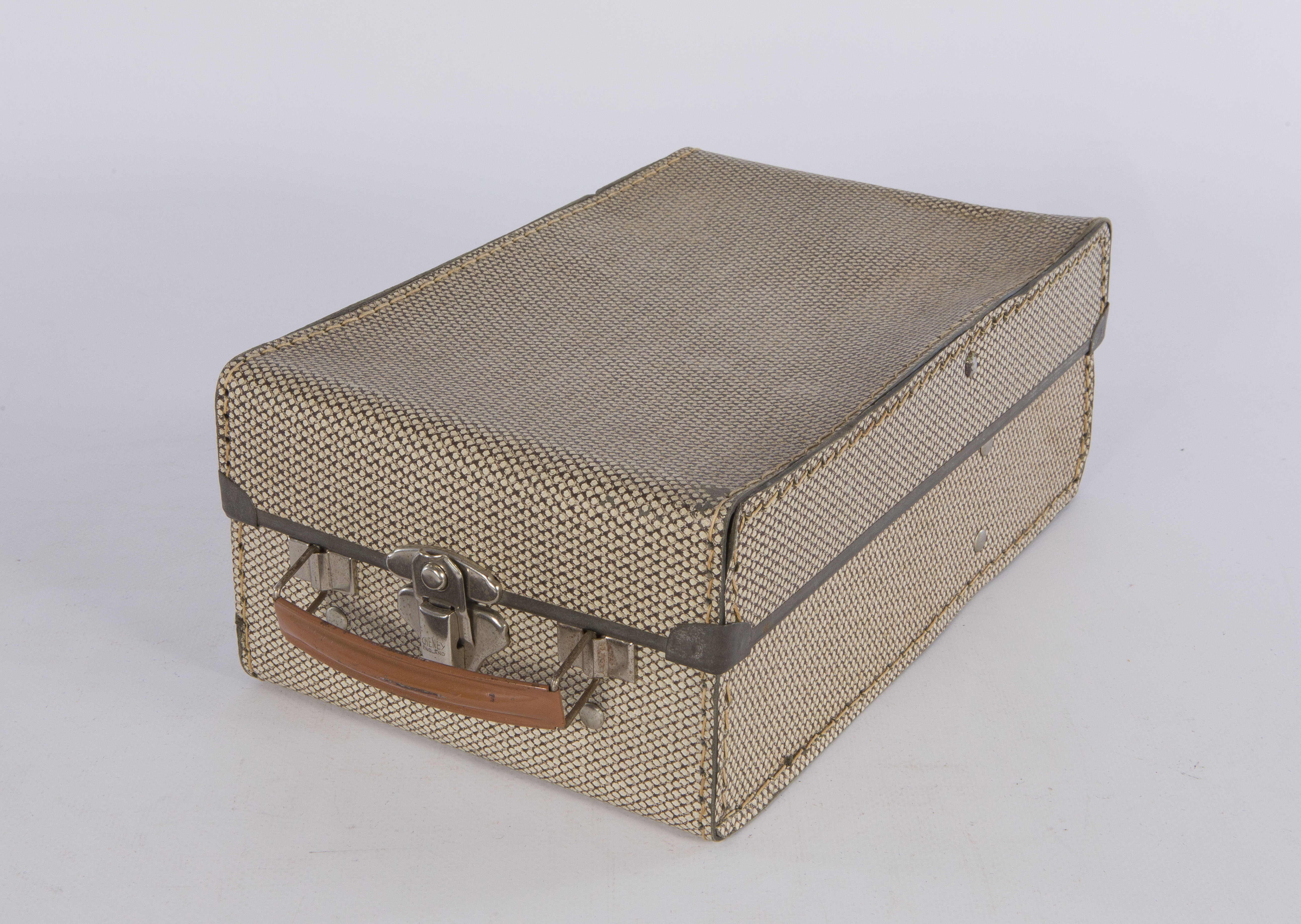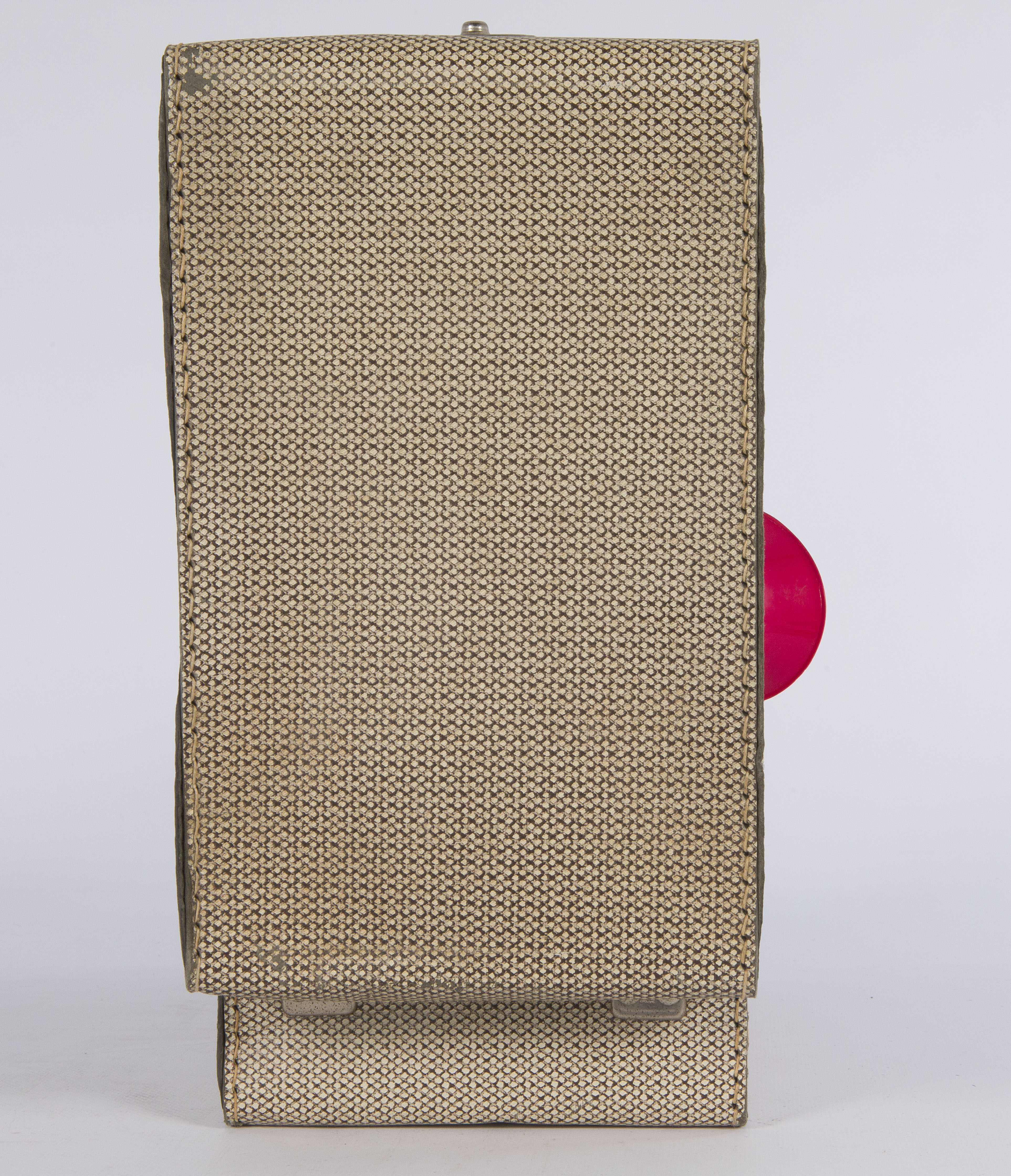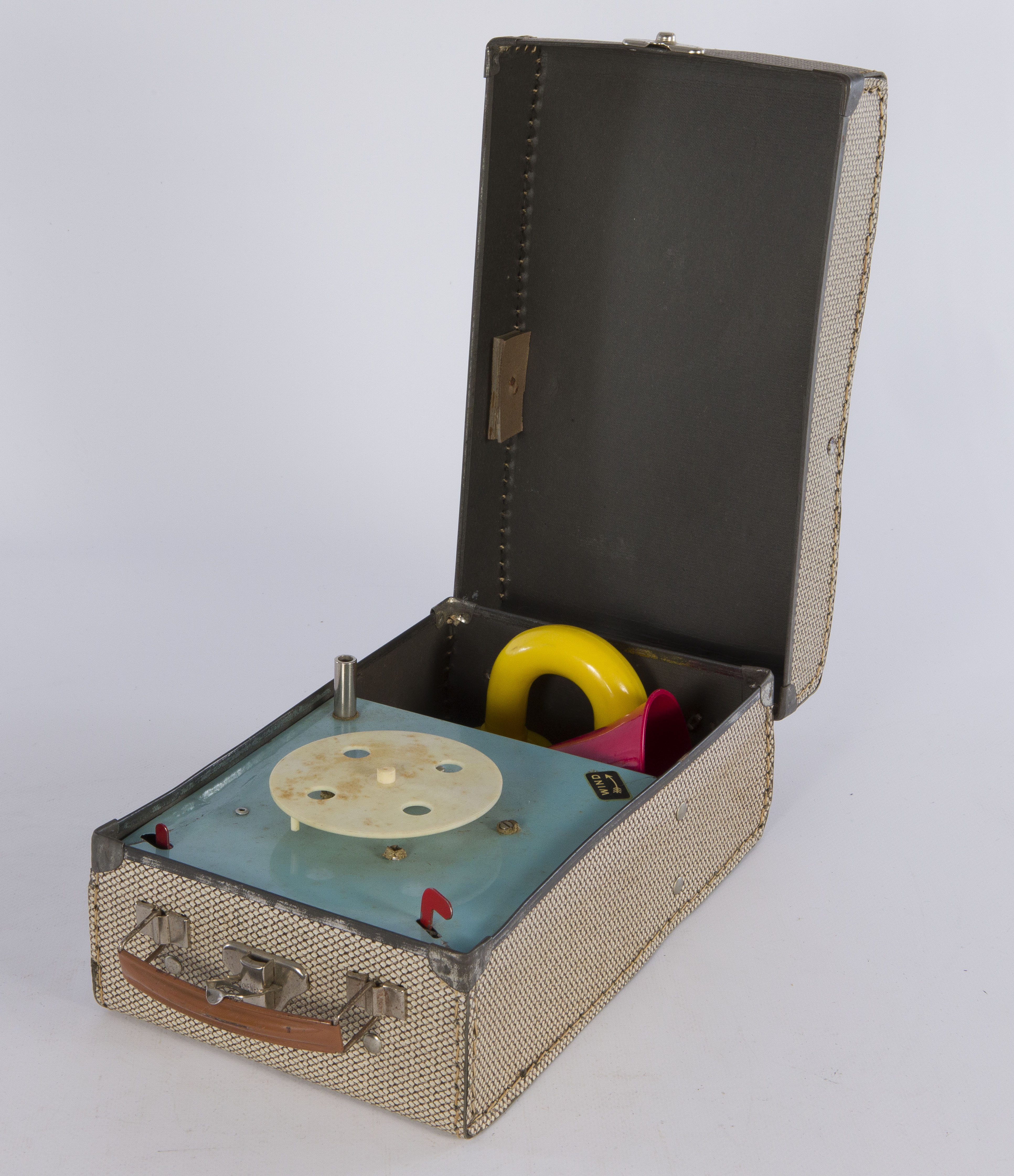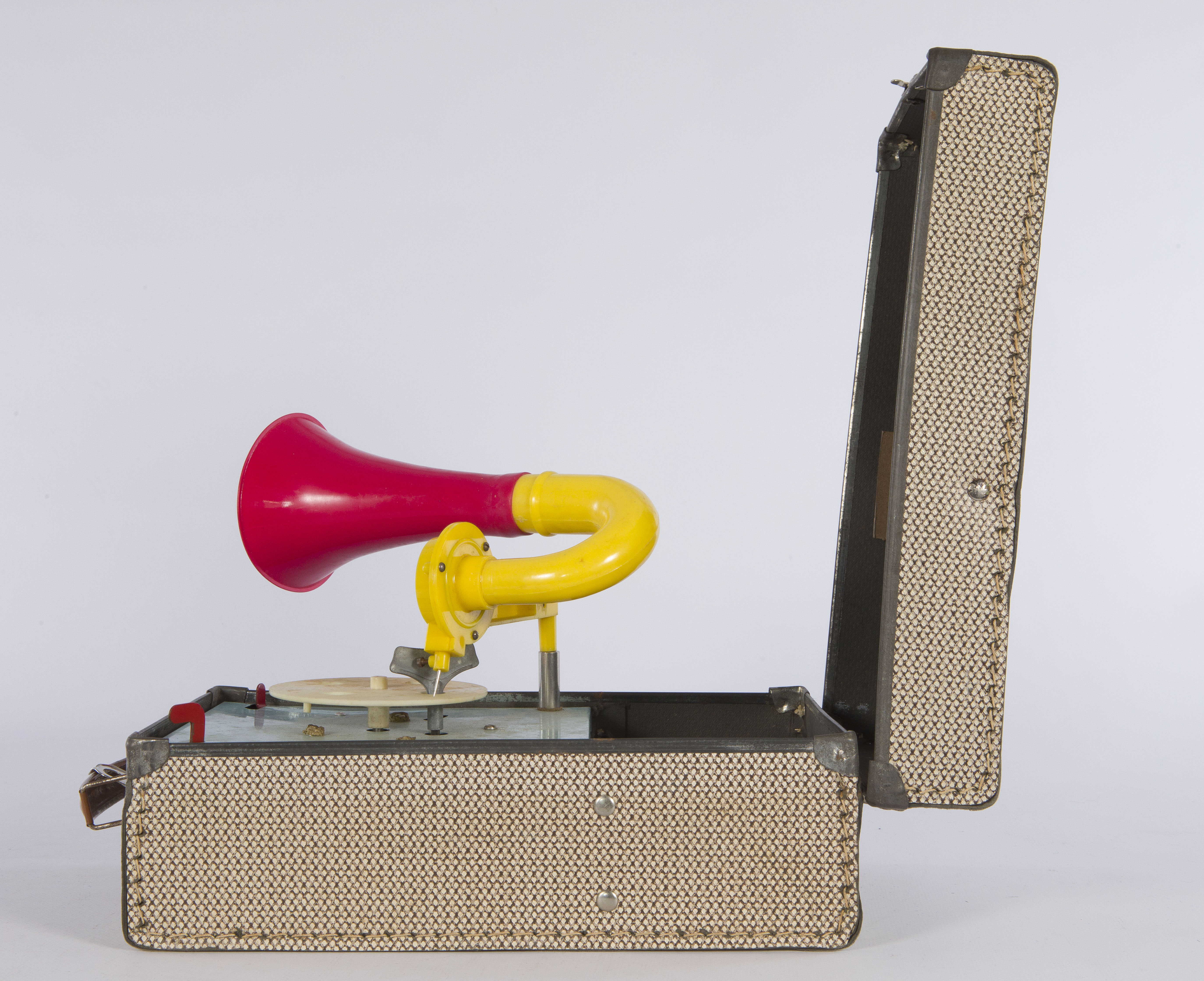 Contenitore: valigetta rettangolare di cartone con maniglia, chiusura a levetta, sul lato breve, e rinforzi angolari in metallo. All’interno della scatola è fissata una piastra in latta smaltata di colore celeste, su cui è alloggiato il piatto in plastica bianca, la levetta del freno e la leva del regolatore di velocità. Inoltre nel l’angolo sinistro posteriore della piastra è presente un foro per l’inserimento del braccio acustico. Il braccio acustico, il diaframma e l’alloggio per la tromba costituiscono un unico pezzo in plastica gialla. La tromba è in plastica rossa e viene montata al braccio acustico collegato al diaframma.. Motore: occultamento del meccanismo al di sotto della piastra in metallo removibile; propulsione a una molla, stabilizzatore di velocità a due cilindri e sistema di carica a chiavetta in metallo, a incastro sul piatto del disco. Sistema di riproduzione del suono: diaframma e braccio acustico curvo su cui è montata la tromba fissata al piano con un perno. Modalità d’uso: collocare il disco inciso sul piatto e caricare il motore a molla attraverso la rotazione della chiavetta. Sbloccare il sistema di freno e regolare la velocità ruotando il pomello con l’indicatore di velocità; poggiare sul disco la puntina o stilo del diaframma (dall’esterno all’interno). La puntina inizia a scorrere all'interno del solco a spirale inciso sul disco; le oscillazioni della puntina, prodotte dal profilo irregolare dell'incisione, vengono trasmesse alla membrana del diaframma che riproduce il suono, amplificato dalla piccola tromba in plastica