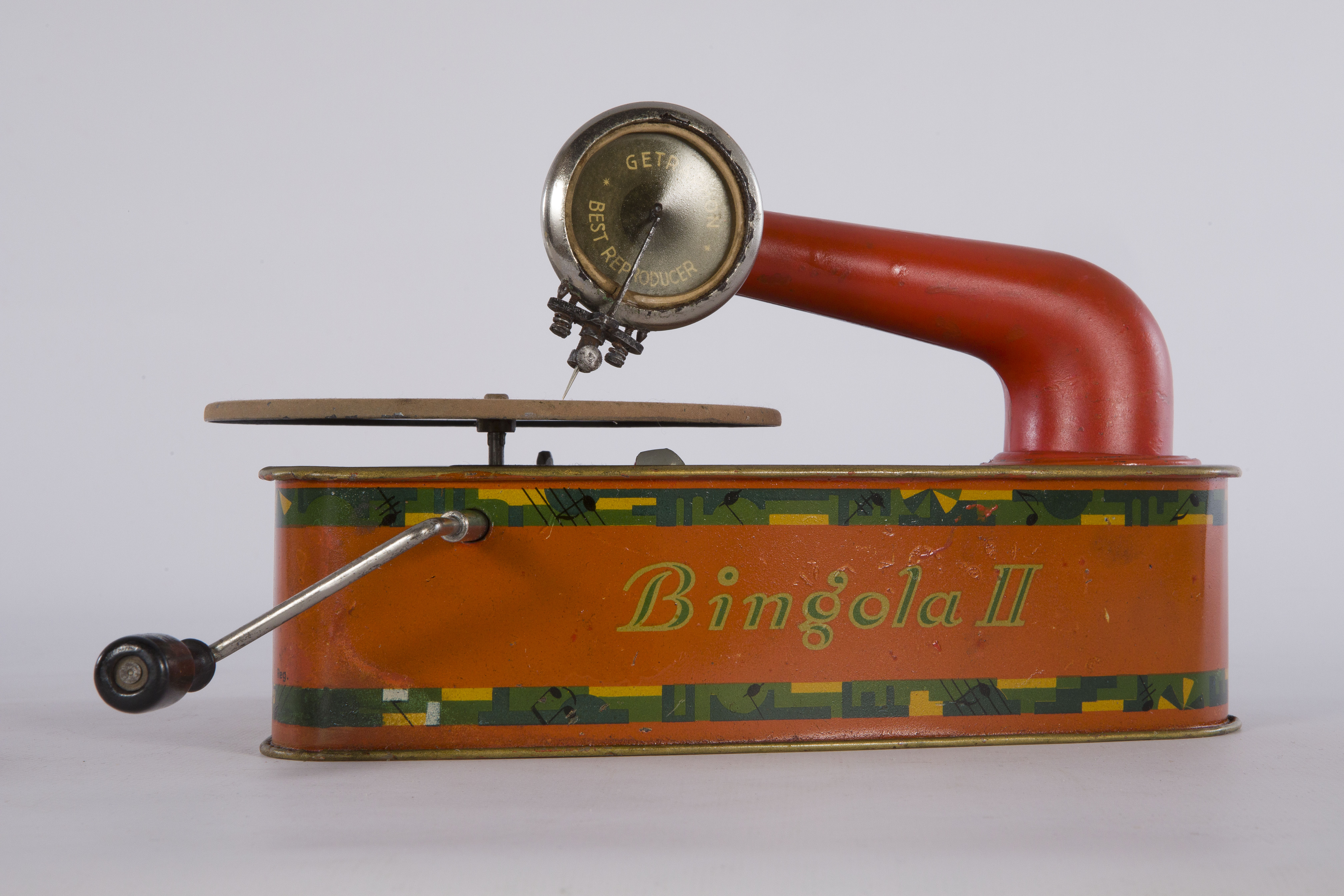 - NOTIZIE STORICO CRITICHE L’industria del suono riprodotto iniziò nel 1877 negli Stati Uniti quando Thomas Edison inventò una maniera di registrare il suono su un foglio di alluminio e di riprodurlo tramite una macchina che chiamò fonografo. Nel corso di una decina di anni, questo sistema venne notevolmente migliorato, prima con l’invenzione nel 1886 dei cilindri di cera Bell-Tainter e poi nel 1887 con l’invenzione del disco e l’adozione dell’incisione orizzontale fatta da Emile Berliner che non solo riproduceva il suono con molta più facilità ma rendeva anche la duplicazione molto più agevole. All’invenzione del disco Berliner accompagnò l’invenzione di una macchina per riprodurlo ovvero il grammofono che venne perfezionata nel 1896 da Eldridge R. Johnson con l’aggiunta del motore a molla. Le prime applicazione del fonografo si rivolsero prima al mondo del lavoro, in particolare nel 1887 Edison fondò la “Edison Phonograph Co.” per la produzione e la vendita di dittafoni, e poi al mondo dei giocattoli quando Edison lanciò sul mercato la prima bambola dotata di un piccolo fonografo montato all’interno del busto che le consentiva di parlare. L’invenzione della registrazione del suono applicata al mondo dei bambini si palesa, quindi, fin dai suoi albori. Agli inizi degli anni Venti del Novecento, grazie al perfezionamento delle tecniche di produzione di motori e diaframmi e agli studi sull'amplificazione acustica, cominciarono a comparire sul mercato dei piccoli grammofoni giocattolo realizzati in latta. Il modello presentato in questa scheda è stato prodotto dall’azienda tedesca Bing Werke. La Bing Werke BW fu un’azienda tedesca, fondata a Norimberga nel 1866 dai fratelli Ignaz e Aldof Bing, che produceva e commerciava in utensili per la casa e soprattutto giocattoli. Famosa per la sua produzione di trenini giocattolo, realizzò diversi modelli di grammofono in latta per i bambini. Uno dei modelli di maggior successo era il modello Bingola, del quale esistono più versioni. Il grammofono giocattolo Bingola II descritto in questa scheda, venne prodotto tra la fine degli anni Venti e gli inizi degli anni Trenta. Si distingue dal modello Bingola I soprattutto per il braccio acustico caratterizzato da una forma conica e ricurva, mentre nel Bingola I il braccio acustico presenta una forma spezzata all’altezza del collo. Inoltre, il Bingola II è di dimensioni leggermente più grandi rispetto al Bingola I che ha una cassa più piccola e una forma più compatta. Sui grammofoni giocattolo Bingola era possibile riprodurre piccoli dischi da 15 o 18 cm