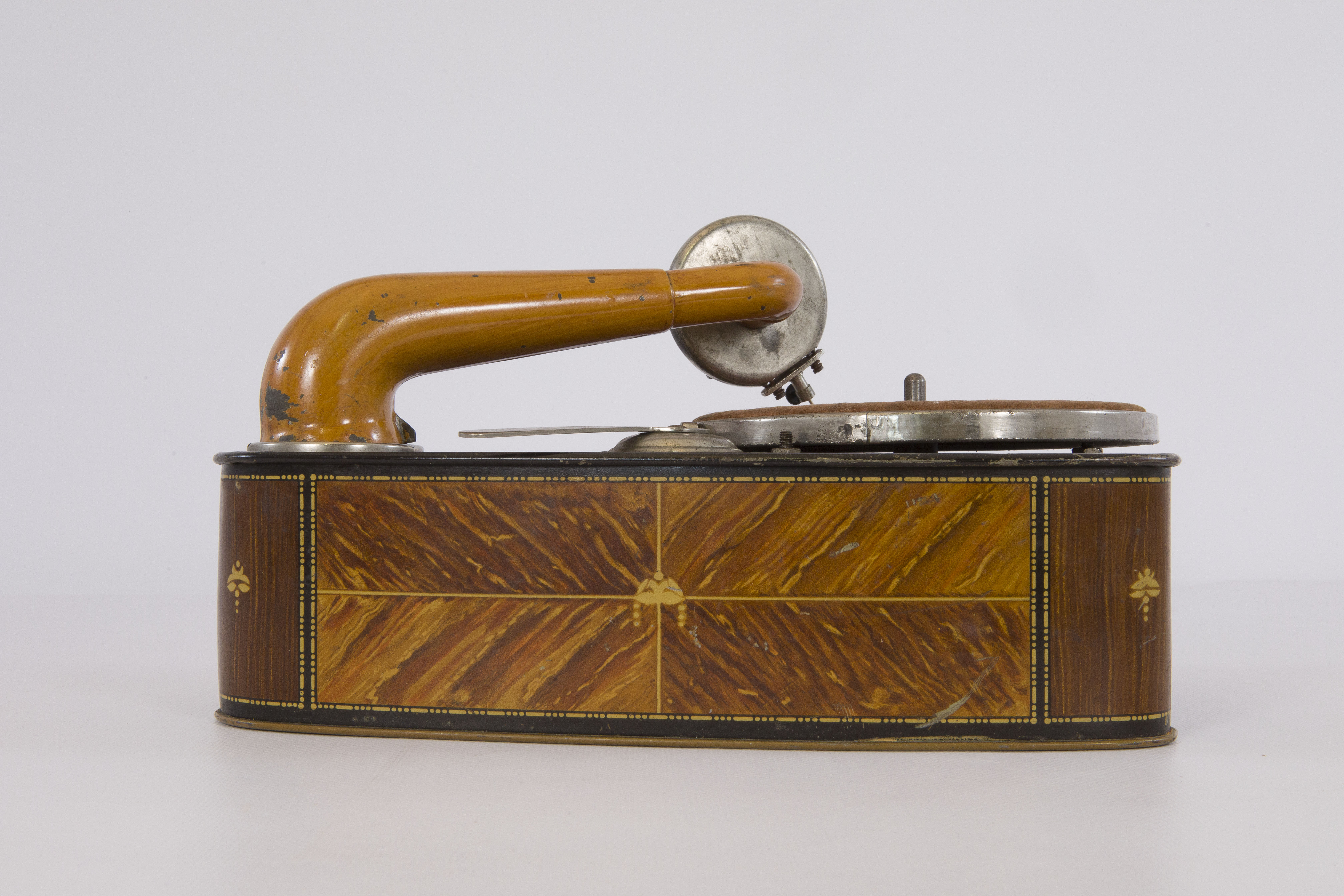 Contenitore: scatola triangolare con angoli stondati in metallo smaltato a intarsio in finto legno e piccoli disegni geometrici. Sul lato destro è presente la manovella per la carica. Sul lato frontale sono presenti la levetta per regolare la velocità e delle fessure per l’uscita del suono dalla cassa che funge da tromba interna. Sulla parte superiore è fissato il braccio acustico tubolare smaltato a finto legno, il piatto del disco rivestito in velluto marrone e il freno. Motore: motore a una molla a propulsione manuale con sistema di carica a manovella con impugnatura in legno e regolatore di velocità. Sistema di riproduzione del suono: diaframma collegato al braccio acustico conico inserito nella scatola contenitrice; il suono viene amplificato dal vano della scatola e fuoriesce dalla griglia presente sul lato frontale della scatola. Modalità d’uso: collocare il disco inciso sul piatto, caricare il motore a molla attraverso la rotazione della manovella. Sbloccare il sistema di freno e appoggiare sul disco la puntina o stilo del diaframma (dall’esterno all’interno). La puntina inizia a scorrere all'interno del solco a spirale inciso sul disco; le oscillazioni della puntina, prodotte dal profilo irregolare dell'incisione, vengono trasmesse alla membrana del diaframma che riproduce il suono, amplificato dal vano della scatola che funge da risuonatore