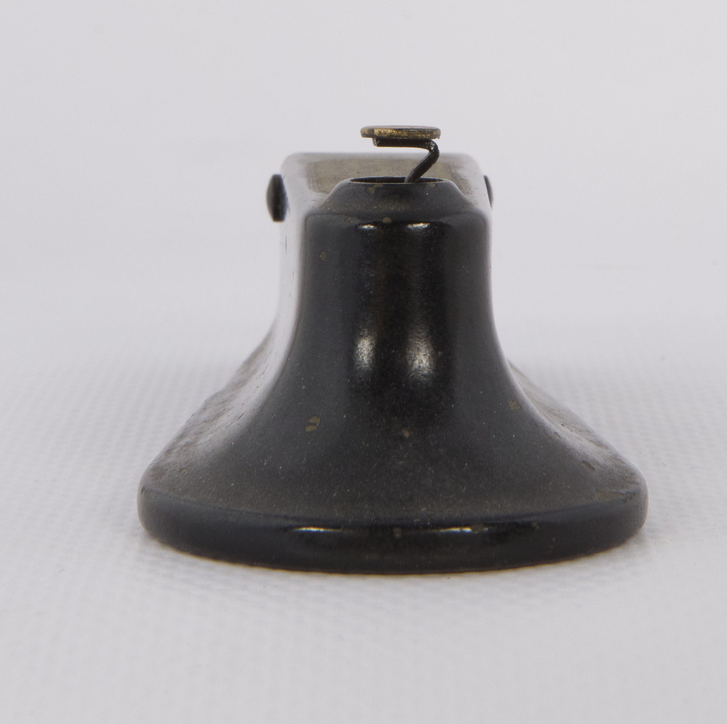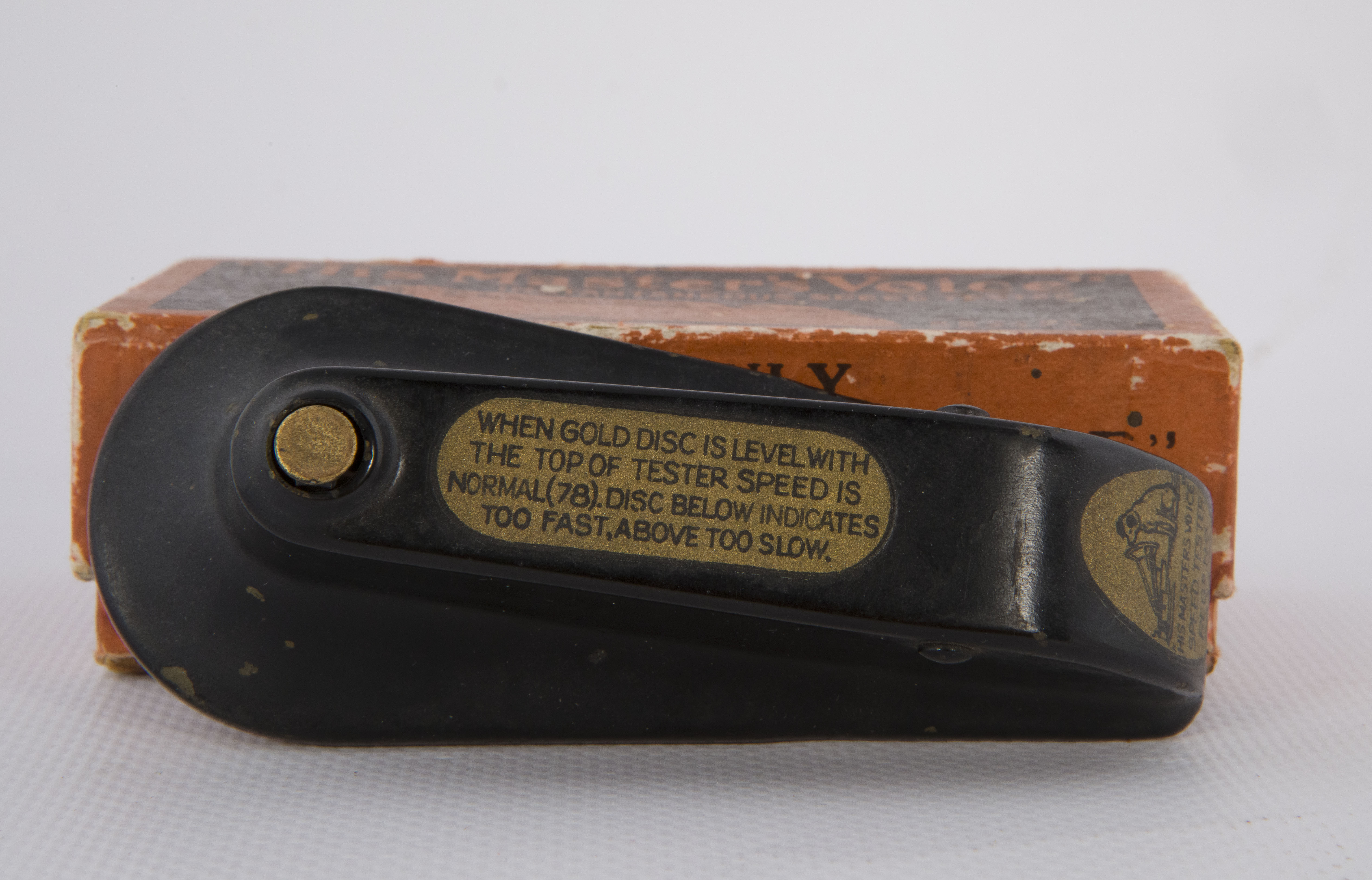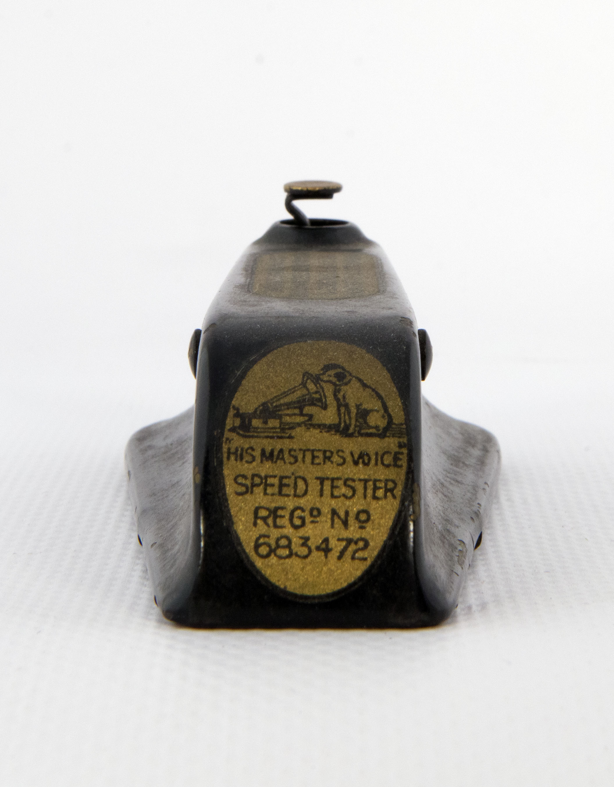 - NOTIZIE STORICO CRITICHE L'industria del suono registrato nacque nel 1877 negli Stati Uniti, quando Thomas Edison inventò un metodo per registrare e riprodurre il suono tramite una macchina chiamata fonografo. Nel corso di circa un decennio, questo sistema venne notevolmente perfezionato: nel 1886 furono introdotti i cilindri di cera Bell-Tainter, seguiti, nel 1887, dall'invenzione del disco e dall'adozione dell'incisione orizzontale da parte di Emile Berliner. Quest'ultima innovazione non solo semplificò la riproduzione del suono, ma facilitò anche la duplicazione su larga scala. L’oggetto descritto in questa scheda, lo Speed Tester di His Master's Voice (HMV) era uno strumento per regolare la velocità di riproduzione dei grammofoni, essenziale per garantire un suono accurato e fedele. Era usato per calibrare la velocità del giradischi, solitamente intorno ai 78 giri al minuto, ma i modelli potevano variare leggermente. Il dispositivo veniva posizionato sul piatto del grammofono e, grazie a un peso bilanciato, permetteva di misurare se il piatto girava alla velocità corretta: il peso si posizionava perfettamente in orizzontale quando il grammofono era ben regolato