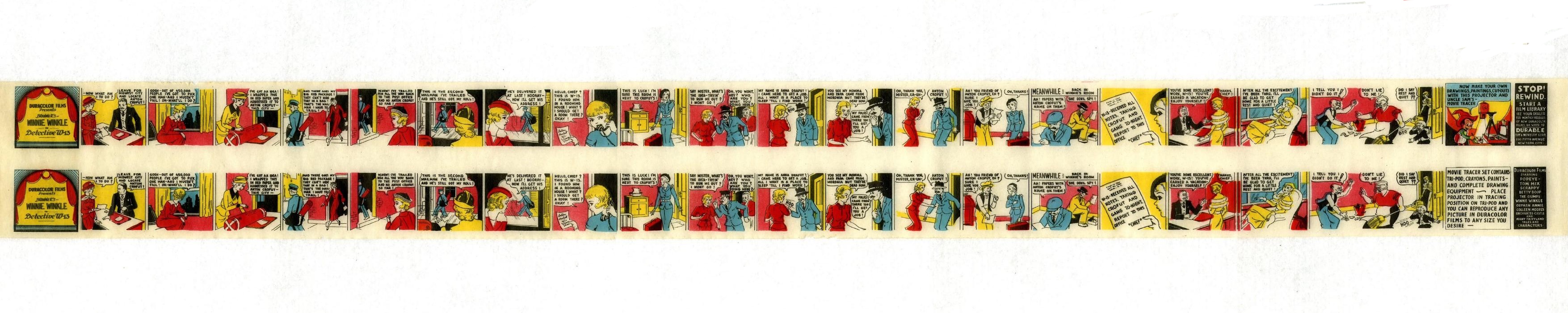 Pellicola per proiezione con il proiettore sonoro Uncle Sam’s/Durotone (vedi inv.345200 scheda 1201354530), prodotto negli anni Trenta del Novecento dalla Durable Toy & Novelty Corp. negli Stati Uniti. La pellicola è in carta velina con disegni animati ad inchiostro e colori e riproduce il cartone animato intitolato “Winnie Winkle in Detective W-13”