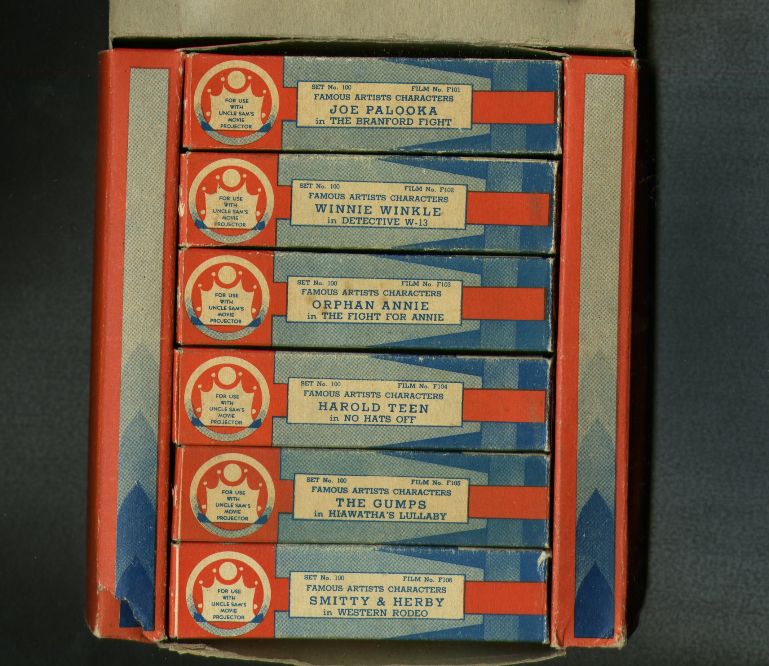 - NOTIZIE STORICO CRITICHE L’industria del suono riprodotto iniziò nel 1877 negli Stati Uniti quando Thomas Edison inventò una maniera di registrare il suono su un foglio di alluminio e di riprodurlo tramite una macchina che chiamò fonografo. Nel corso di una decina di anni, questo sistema venne notevolmente migliorato, prima con l’invenzione nel 1886 dei cilindri di cera Bell-Tainter e poi nel 1887 con l’invenzione del disco e l’adozione dell’incisione orizzontale fatta da Emile Berliner che non solo riproduceva il suono con molta più facilità ma rendeva anche la duplicazione molto più agevole. Parallelamente allo sviluppo della registrazione sonora, anche i settori della fotografia e del cinema stavano evolvendo rapidamente. Tra la fine degli anni Venti e i primi anni Trenta, il perfezionamento delle tecnologie di produzione di motori e diaframmi, insieme agli studi sull'amplificazione acustica, portò alla comparsa sul mercato di grammofoni portatili e di numerosi modelli giocattolo destinati ai bambini. Tra i più popolari vi erano i proiettori con sonoro a disco, progettati per riprodurre cartoni animati in formato ridotto. Uno dei modelli più noti è il proiettore “Uncle Sam’s” e il grammofono “Durotone”, fabbricati negli anni Trenta del Novecento dall’azienda produttrice di giocattoli Durable Toy & Novelty Corp. con sede a New York. Il dispositivo è fatto per proiettare cartoni animati di carta sul muro mentre il suono corrispondente avviene tramite la riproduzione di un disco di piccole dimensioni tramite il grammofono incluso