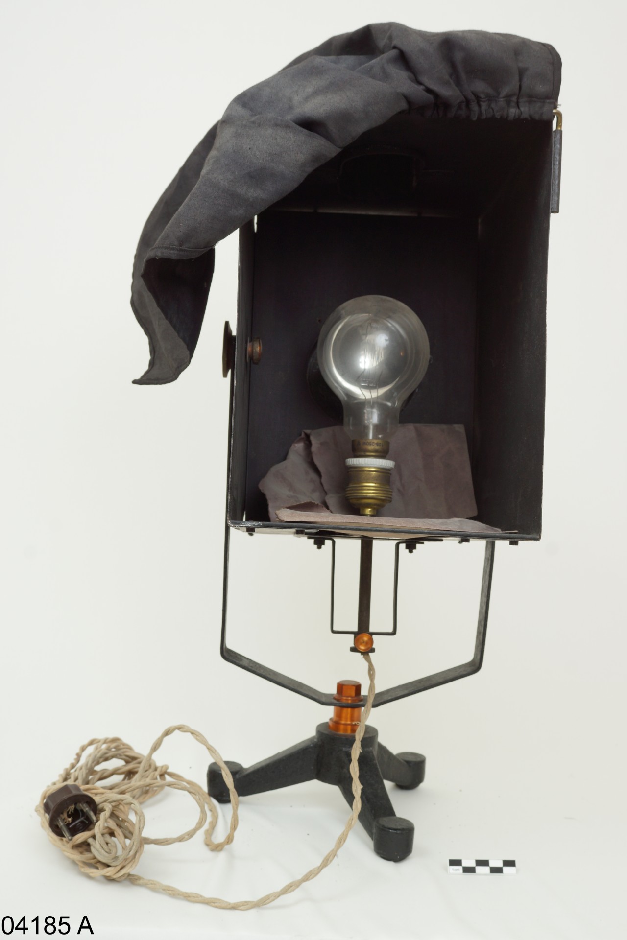 Questa lanterna magica (in cattivo stato di conservazione) è costituita da una scatola in metallo, annerita all'interno, con un camino e parte della base aperta per la circolazione dell'aria. La scatola, sorretta da un treppiede, è orientabile e contieneil bulbo sferico di una lampada ad incandescenza di alta potenza, alimentata da un cavo elettrico che attraversa la base della scatola. Una tendina nera chiude il fondo della lanterna