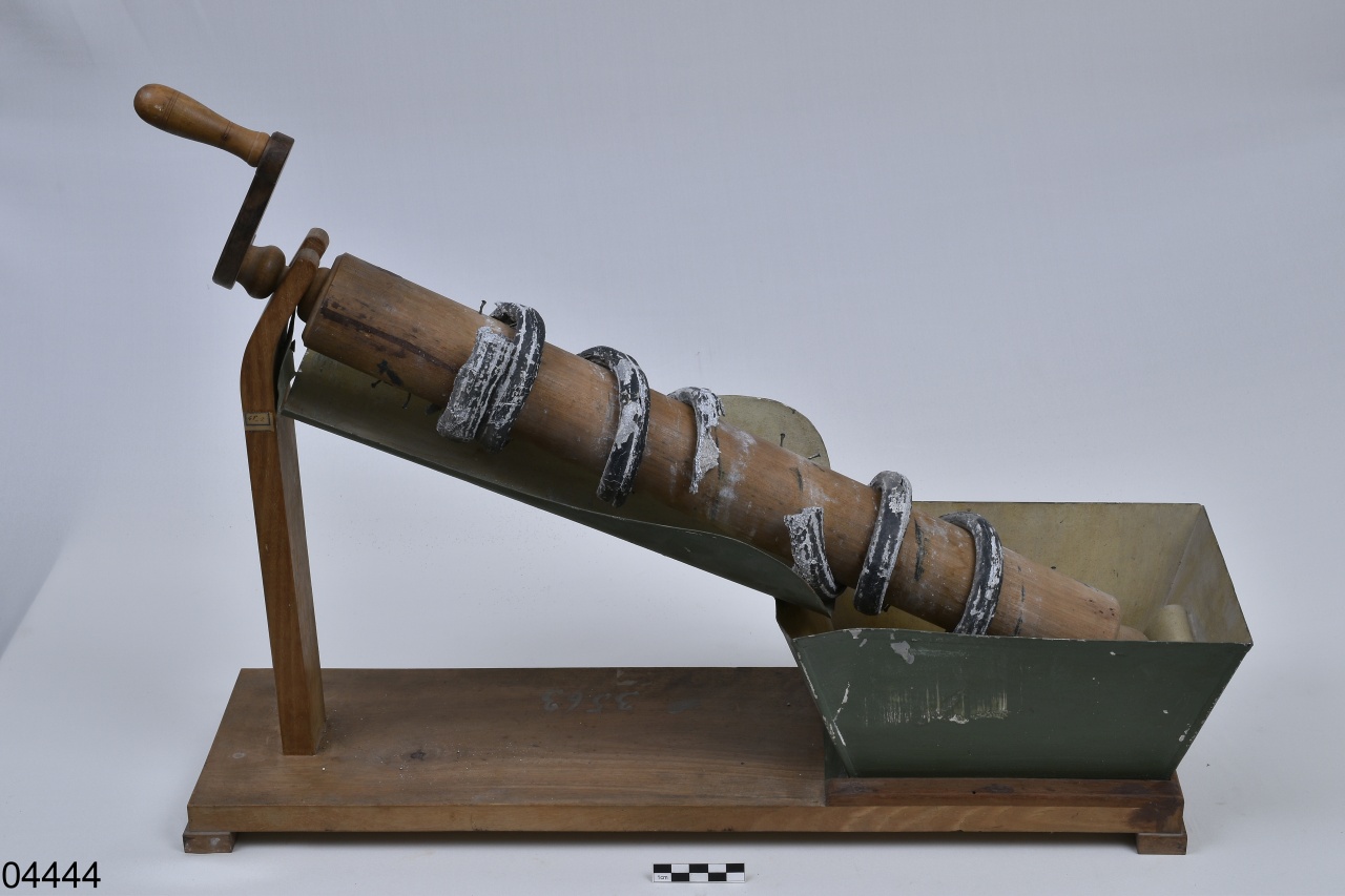 Una base rettangolare in legno dotata di quattro piedini sostiene ad una estremità una vaschetta in lamiera di ferro per contenere acqua e all'altra estremità una tavoletta lignea verticale sulla quale sono collocati un canale di raccolta dell'acqua sollevata e la vite di Archimede (coclea). Questa vite è costituita da un cilindro in legno inclinato, munito all'estremità superiore di una manovella ed imperniato all'estremo inferiore in modo da poter ruotare attorno al proprio asse. Sul cilindro è avvolto elicoidalmente un tubo in gomma la cui parte inferiore pesca nella vaschetta e la parte superiore scarica il liquido sollevato nel canale di raccolta