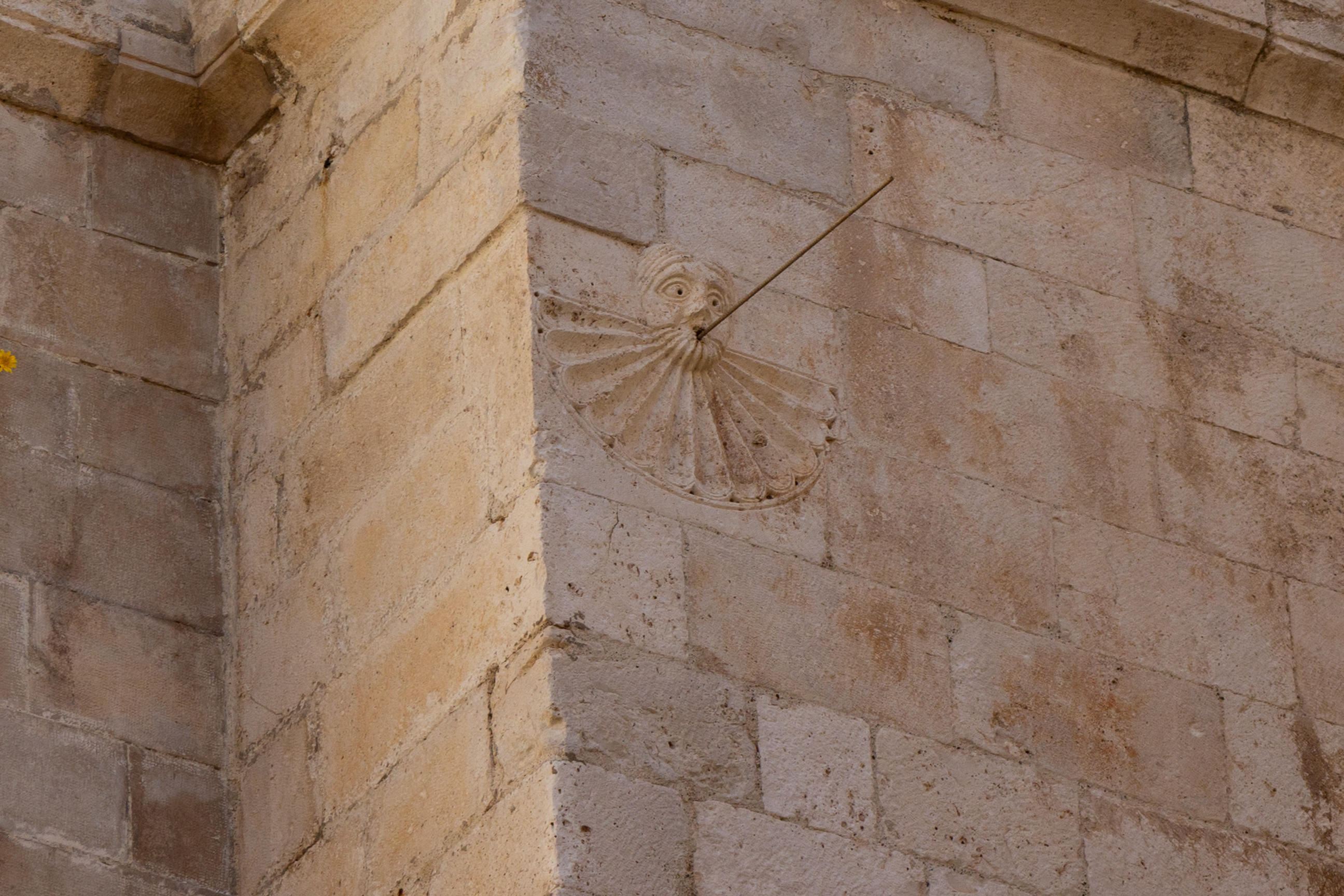 A sinistra della porta d’accesso meridionale del Duomo , in prossimità dello spigolo dell’edificio, a circa otto metri d’altezza dal suolo, è visibile un orologio solare medievale. In Puglia si conservano alcuni tra gli esemplari migliori di orologi solari medievali d’Italia e tra questi quello di Molfetta è uno dei più particolari, scolpito in bassorilievo, appare integro nelle sue decorazioni. Si tratta di un orologio solare ad ore temporarie, cioè ricavate dalla divisione dell’arco diurno in dodici parti uguali. Non può essere annoverato tra quelli canonici essendo privo di riferimenti alle ore di preghiera. Gli orologi solari verticali venivano normalmente incisi a lato degli edifici, come riscontrato in varie località, ed in particolar modo sui muri di chiese o di antichi edifici rurali; anche il posizionamento di quello di Molfetta sulla parete meridionale della chiesa rientra tra le caratteristiche comuni alla maggior parte degli esemplari di questo tipo. L’emiciclo dell’orologio è diviso in dodici porzioni ricavate all’interno di scanalature dalle estremità arrotondate. Queste hanno origine dalla bocca di un volto antropomorfo scolpito all’estremità superiore, fluiscono dalla stessa apertura in cui è conficcato lo gnomone (stilo metallico) ricadendo sul mento e su parte delle guance della figura. Il volto è stato più volte ricondotto a quello di una donna, ma con maggiore probabilità potrebbe trattarsi di una maschera mitologica con funzione apotropaica. È noto, infatti, che mostruose figure di protezione scolpite nella pietra furono largamente impiegate negli edifici di Molfetta. Si tratta di un orologio solare ad ore temporarie, cioè ricavate dalla divisione dell’arco diurno in dodici parti uguali. Non può essere annoverato tra quelli canonici essendo privo di riferimenti alle ore di preghiera. Gli orologi solari verticali venivano normalmente incisi a lato degli edifici, come riscontrato in varie località, ed in particolar modo sui muri di chiese o di antichi edifici rurali; anche il posizionamento di quello di Molfetta sulla parete meridionale della chiesa rientra tra le caratteristiche comuni alla maggior parte degli esemplari di questo tipo. L’emiciclo dell’orologio è diviso in dodici porzioni ricavate all’interno di scanalature dalle estremità arrotondate. Queste hanno origine dalla bocca di un volto antropomorfo scolpito all’estremità superiore, fluiscono dalla stessa apertura in cui è conficcato lo gnomone (stilo metallico) ricadendo sul mento e su parte delle guance della figura. Il volto è stato più volte ricondotto a quello di una donna, ma con maggiore probabilità potrebbe trattarsi di una maschera mitologica con funzione apotropaica. È noto, infatti, che mostruose figure di protezione scolpite nella pietra furono largamente impiegate negli edifici di Molfetta. Inoltre, nel territorio pugliese è facile imbattersi in questi volti scolpiti, rilevati sulle antiche torri o sul prospetto delle masserie di campagna, come pure nei centri storici e nei palazzi centrali delle città. Essi rimanderebbero alle teste delle gòrgoni greche che proteggevano le entrate dai templi, esibendo mostruose bocche spalancate e le lingue pendenti