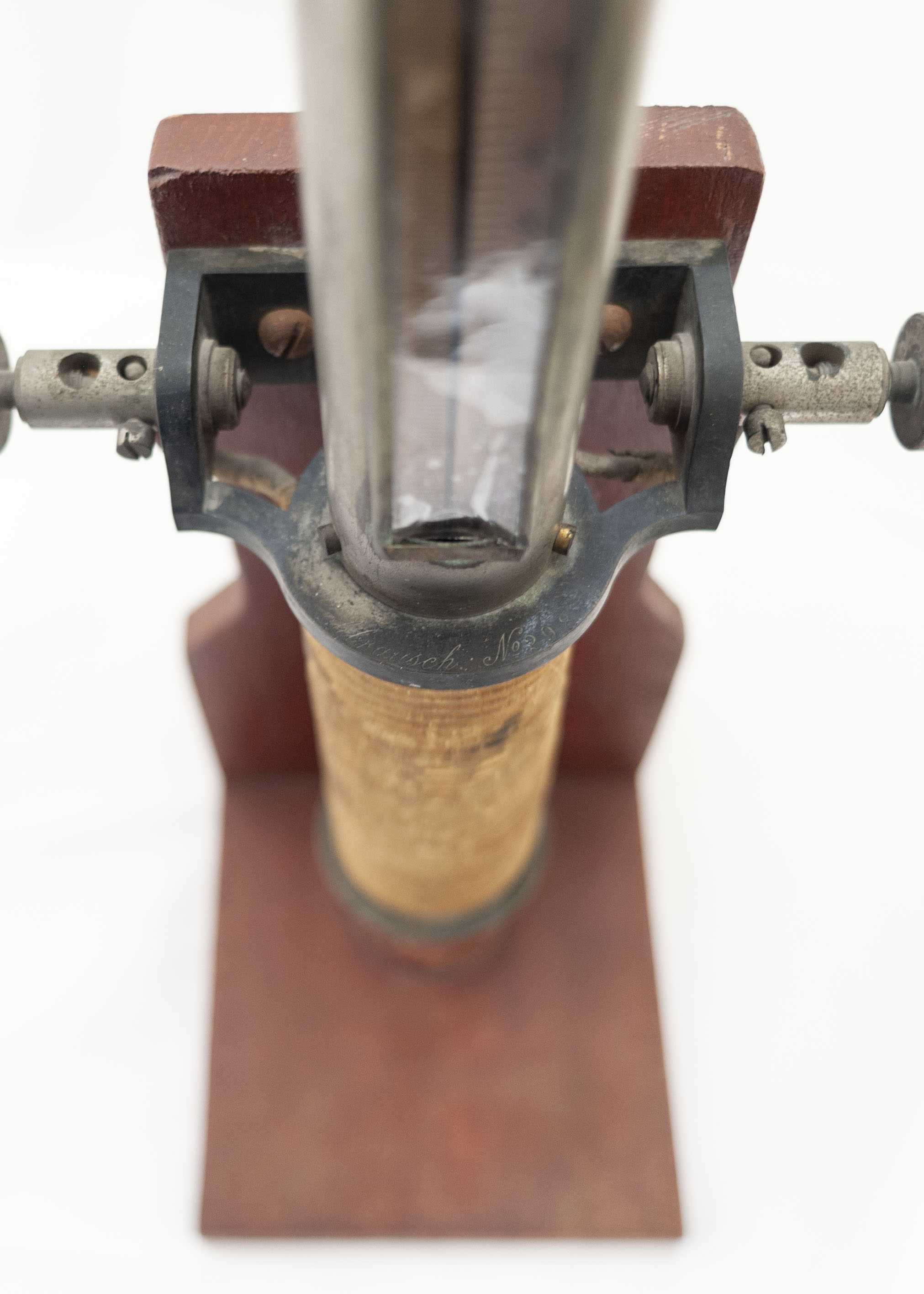 L’Amperometro di Kohlrausch si basa sull’attrazione che una bobina percorsa da corrente esercita su un cilindro di ferro dolce. La bobina, posta verticalmente, è composta da spire di filo conduttore rivestito di materiale isolante, i cui capi terminano ad una coppia di serrafili. Il cilindro di ferro dolce, parzialmente inserito all’interno della bobina e sospeso mediante una molla, è collegato ad un ago indicatore ed è inserito in un tubo metallico munito di una finestra verticale. In corrispondenza della finestra vi sono due scale stampate su carta, una graduata da 0 a 45 AMP con divisioni da 1 unità, una da 0 a 13 con divisioni da 0,1 unità. L'ago indicatore, solidale col cilindro, scorre lungo la scala graduata e segna la misura della corrente, in Ampere. Il tubo metallico presenta lateralmente un foro, che consente lo spostamento di una leva, e nella parte superiore 6 fori circolari. Lo strumento è montato su una base in legno