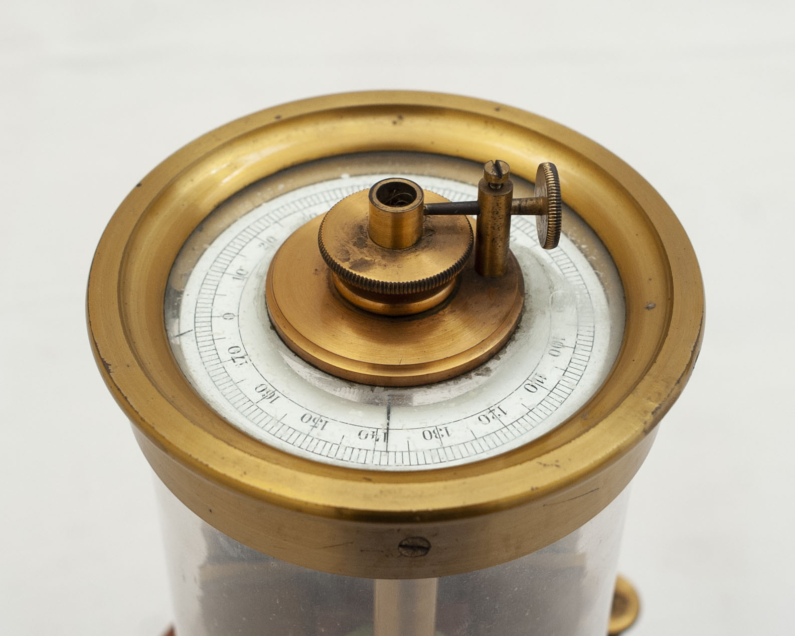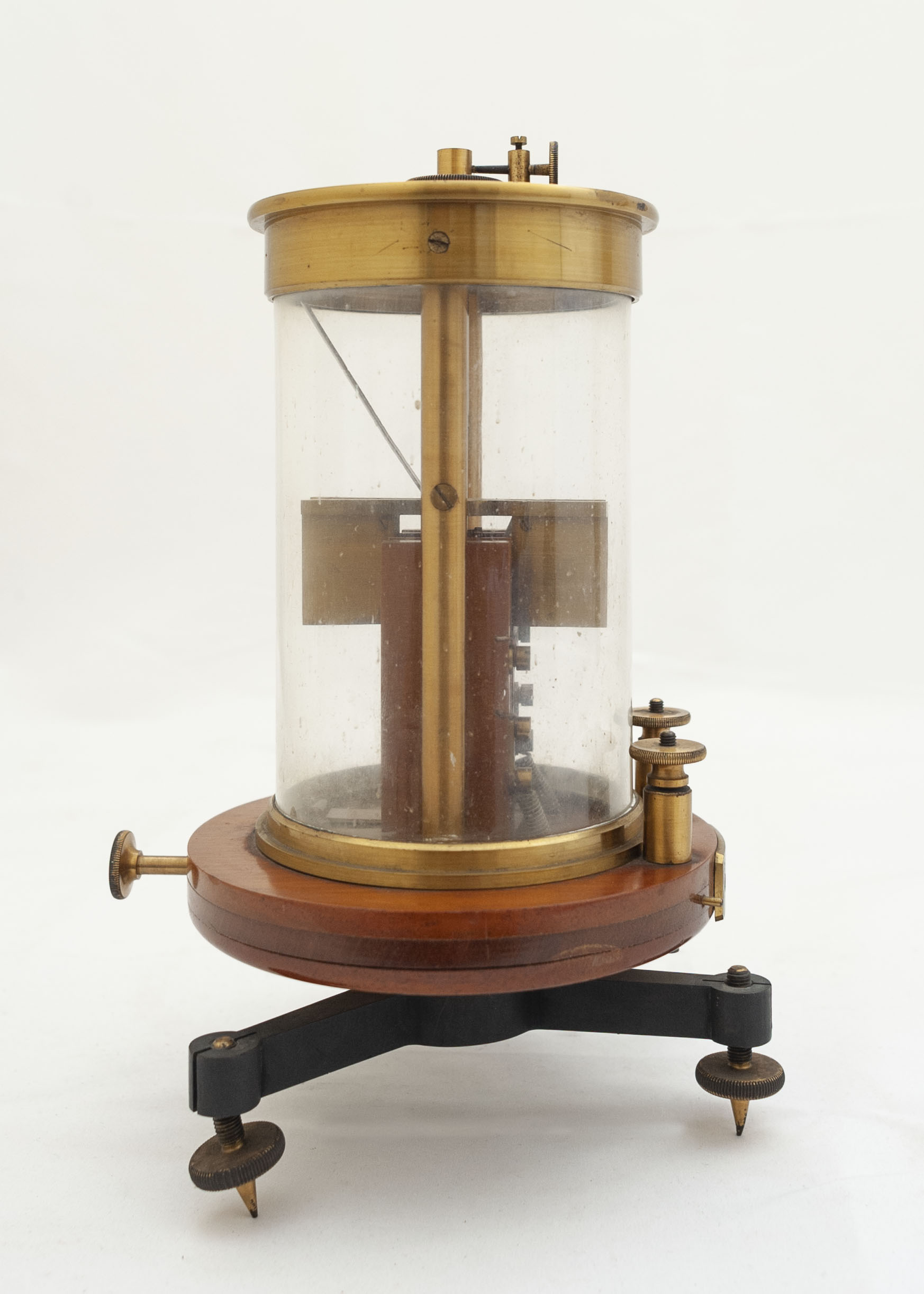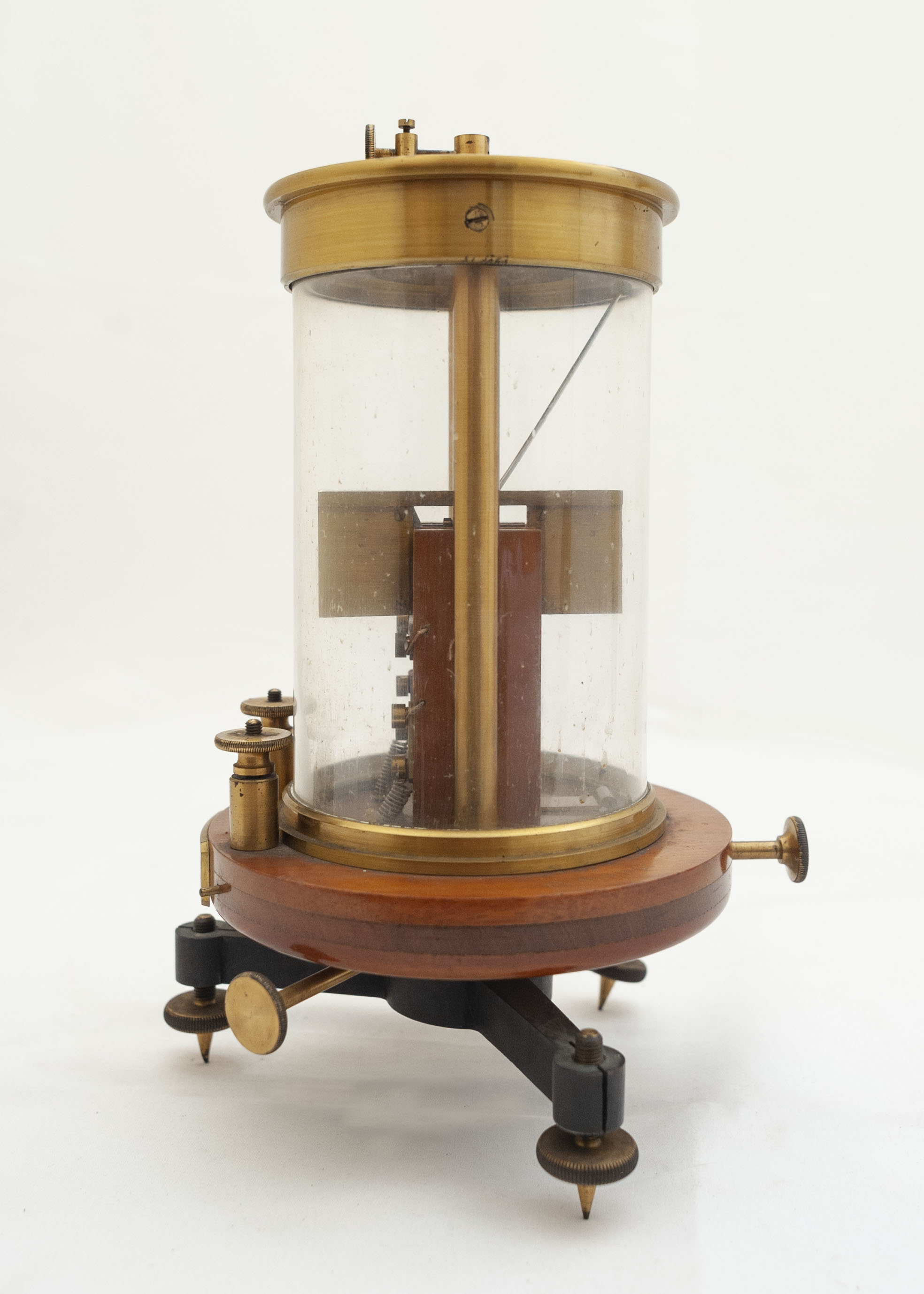 Lo strumento, protetto da un cilindro di vetro, fissato ad una base lignea circolare sostenuta da un treppiedi di metallo munito di tre viti calanti, si compone di due telai di forma rettangolare uguali e affacciati l’uno all’altro parallelamente in posizione verticale. Le spirali, avvolte su ciascun telaio, sono collegate tra loro. Tra i due telai un piccolo ago magnetico a forma di campana è sostenuto da una sottile molla di acciaio. Quando l’ago è deviato dalla corrente che circola nelle spirali, lo si richiama nella posizione di riposo torcendo, mediante un bottone posto sulla sommità dello strumento, la molla che lo sorregge. Il grado di torsione, leggibile sulla scala graduata circolare mediante un indice, è proporzionale alla differenza di potenziale tra i punti collegati ai capi liberi delle spirali. Sulla base sono presenti due serrafili