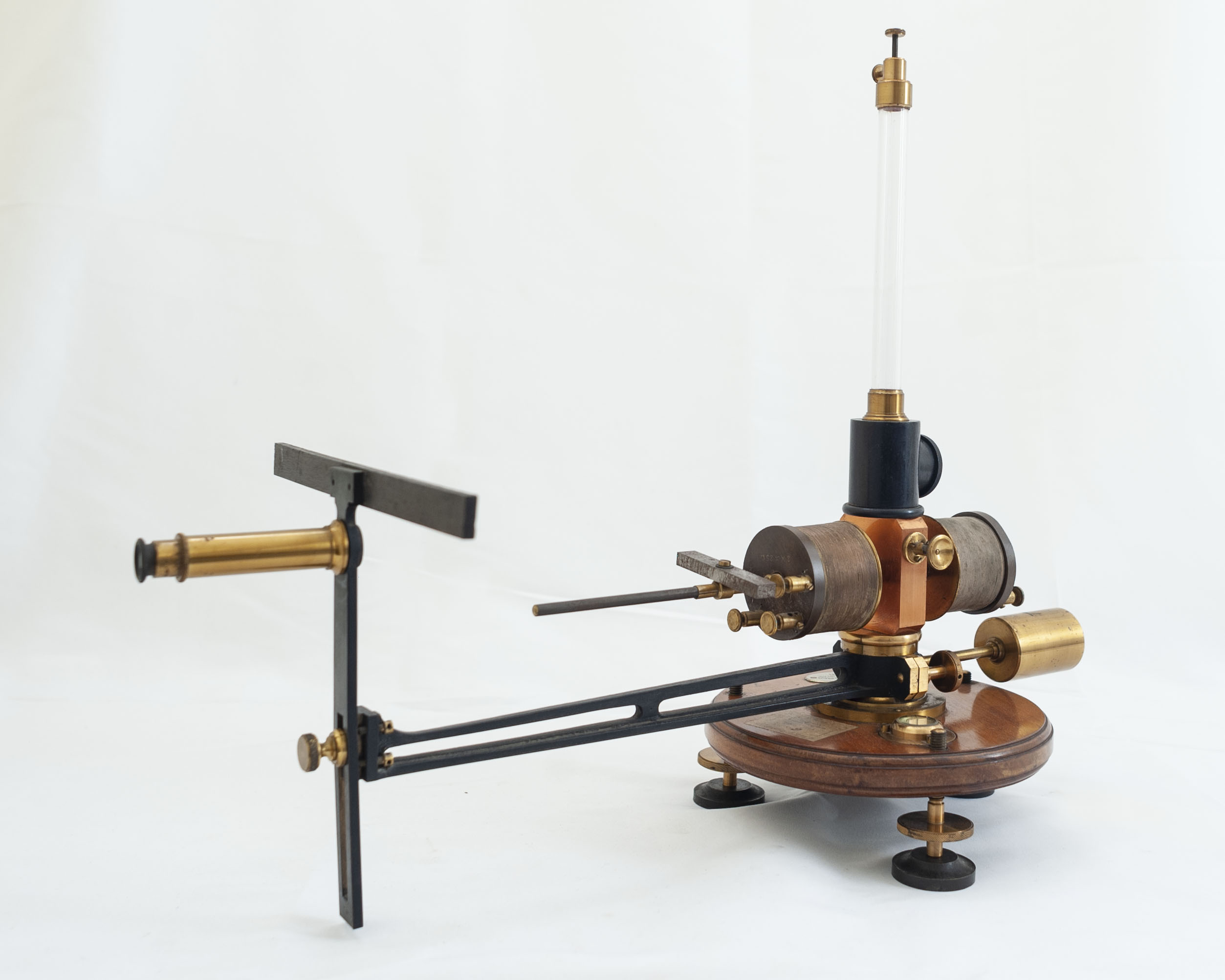 Il galvanometro è montato su una base circolare di legno munita di tre viti calanti. Su un'asta metallica (graduata) fissata orizzontalmente possono scorrere due bobine montate da parti opposte rispetto ad un magnete posto all'interno di un cilindro. Il magnete è sostenuto da un filo di seta contenuto in un tubo di vetro verticale terminante con un serrafilo di ottone. Uno specchio circolare è fissato ad una asticella solidale con il magnete e può essere osservato attraverso una apertura circolare, in un alloggiamento alla base del tubo di vetro. La scala e il cannocchiale permettono di misurare le deviazioni dello specchio. Sulla base è presente una livella a bolla
