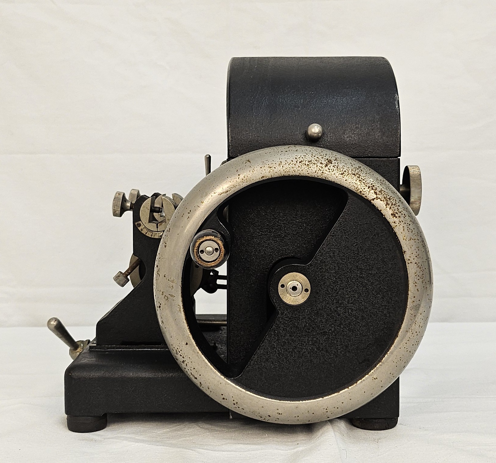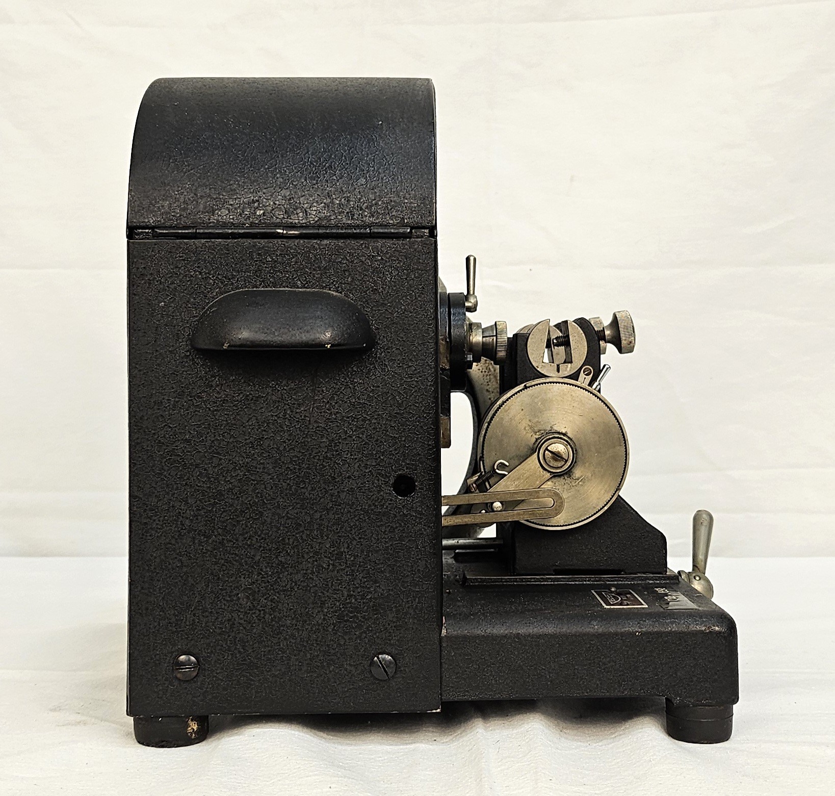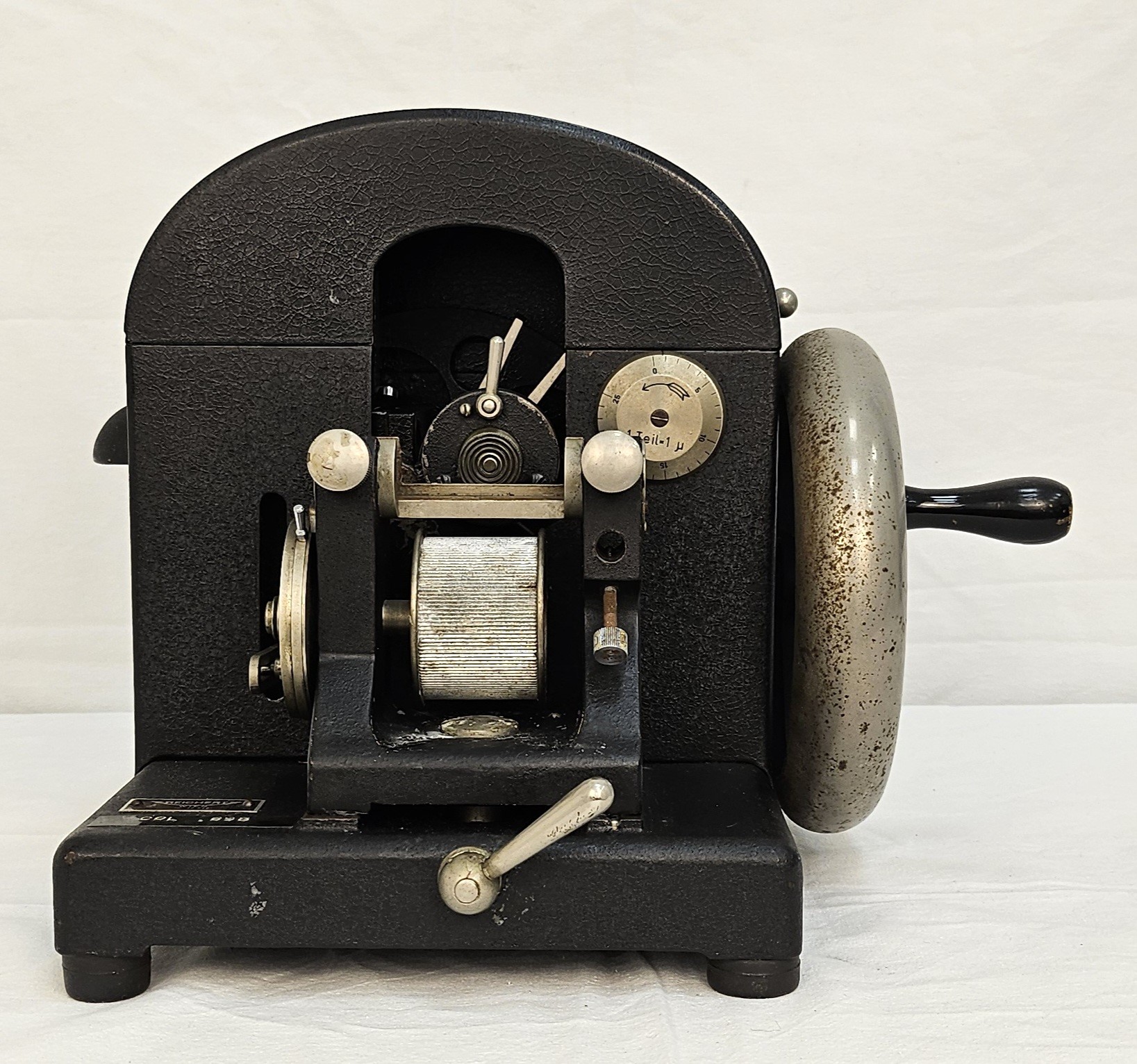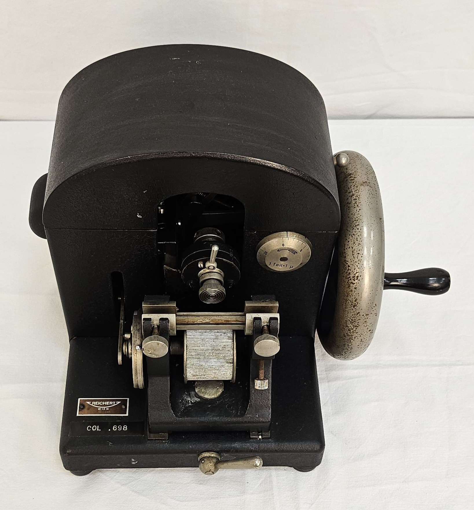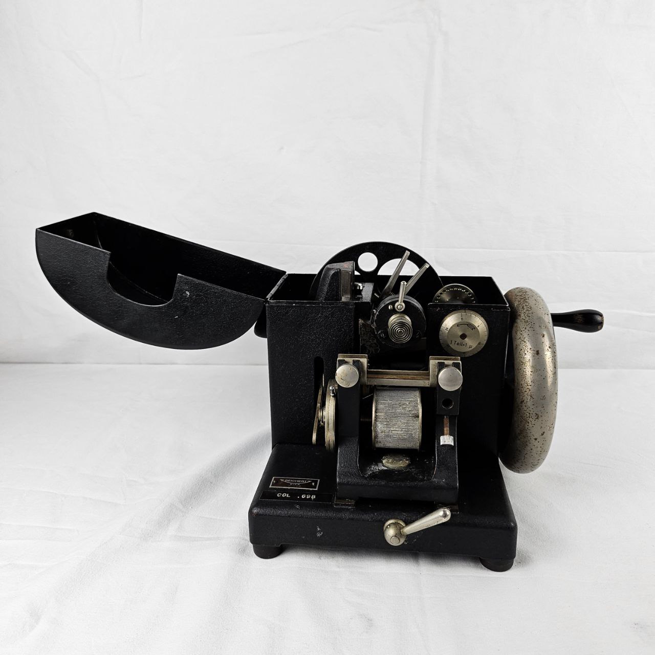 il microtomo a rotazione di Reichert è uno strumento meccanico da laboratorio per la preparazione di sezioni sottili di tessuti biologici. Presenta una struttura in metallo di colore nero con volano laterale per il controllo della lama e regolatore micrometrico dello spessore di taglio. È dotata di un meccanismo di avanzamento del campione e una copertura apribile per l’accesso ai componenti interni